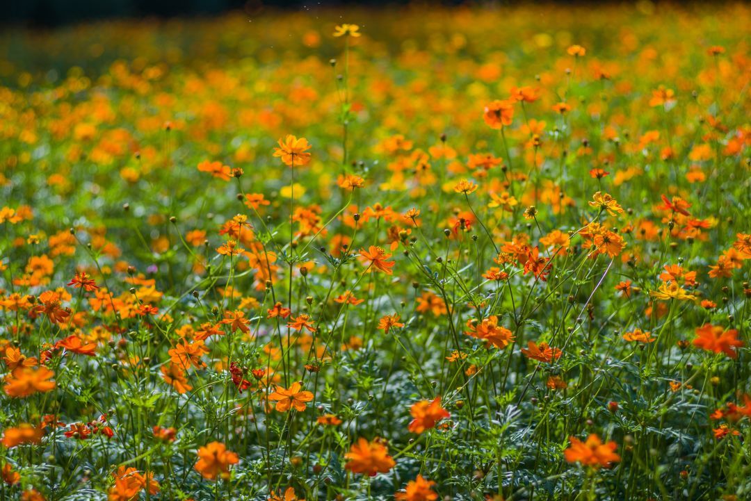 金黄灿烂的硫华菊争奇斗艳,阳光铺洒在花海之中,柔枝随着微风轻拂摆动,整片花海闪烁着灵动耀眼的光芒。