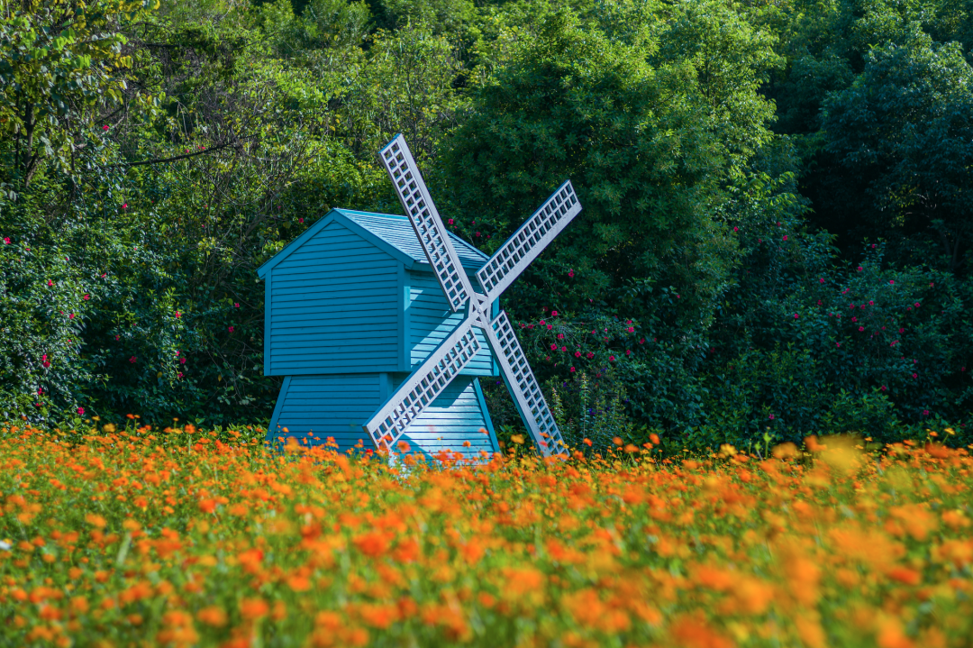 星罗棋布的百日草花海像打翻的调色盘,在蓝天白云相映衬下如童话世界般梦幻。