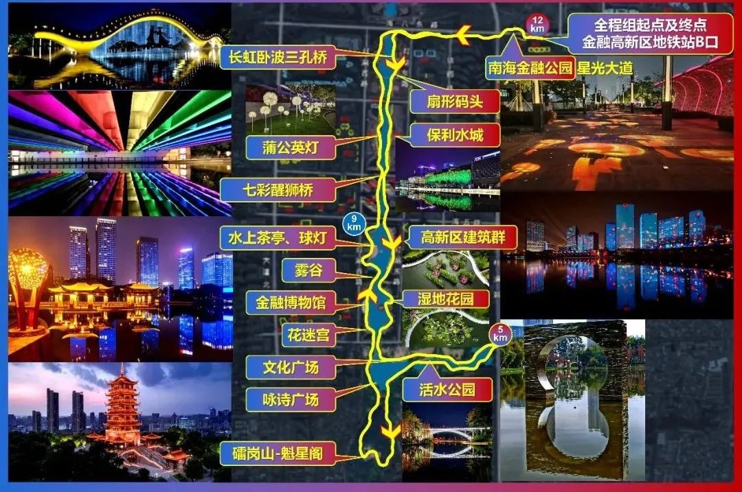 徒步线路:从南海金融公园出发→灯湖市政公园→保利MALL→千灯湖→活水公园→魁星阁→对岸回程至南海金融公园。