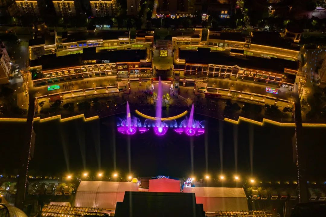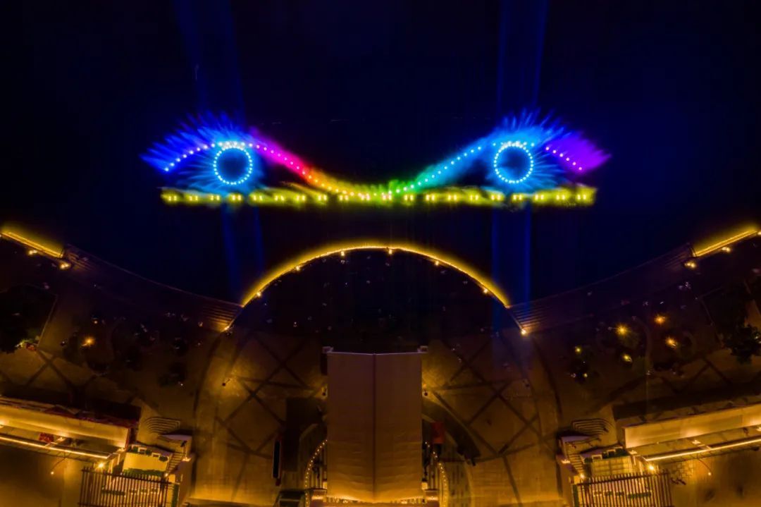 在灯湖西街前的湖面,灯光水幕全息水秀的南海醒狮点睛造型,高空俯瞰,狮眼栩栩如生。