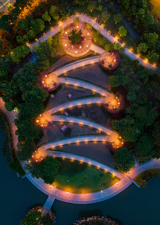 千灯廊亭、灯湖塔台、三孔桥体、草坪空地,桥梁景观与绿地空间成为城市叠加的风景。