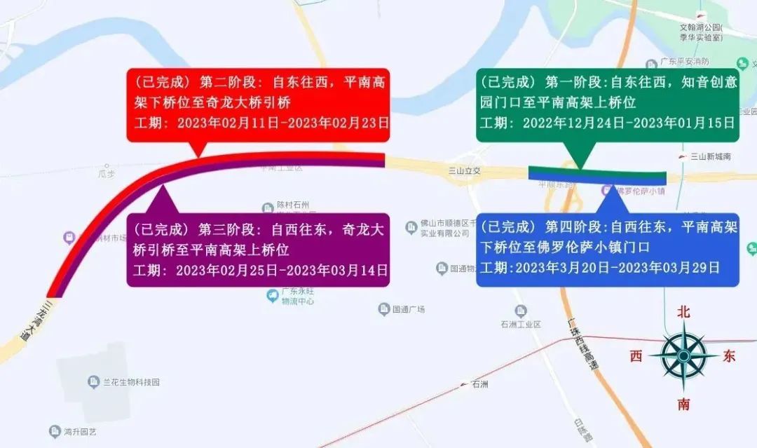第二阶段:2023年02月11日-2023年02月23日,已完成(自东向西,广州往佛山方向主道)平南高架下桥位至奇龙大桥上桥位的沥青罩面、路面基层病害处理、标线划设等改造工作。
