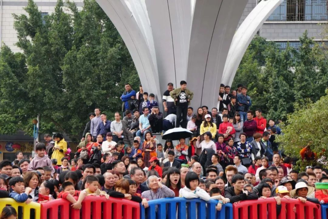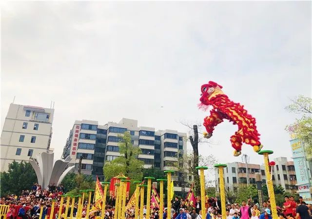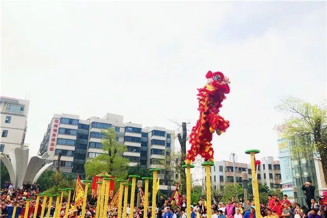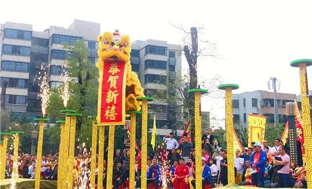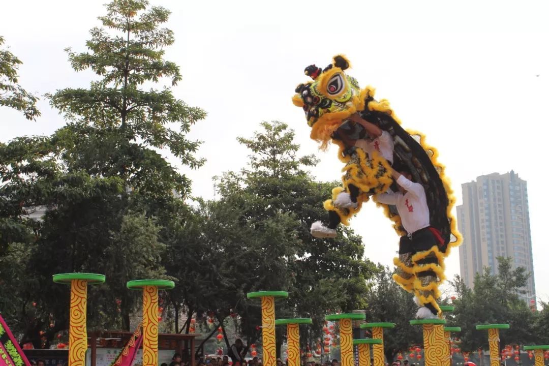 最让人期待的莫过于高桩醒狮环节!相比起传统醒狮注重的主题叙事形式,高桩舞狮则对技巧的要求更多。听那鼓点有节奏地响起,舞狮头者一跃而上,并进行连续的跳跃、钳腰进行大环旋、吊在桩上仍神态自若……高桩舞狮每一个高难度的动作都赢得了观众们的热情欢呼与喝彩。据介绍,高桩舞狮是从武术中的梅花桩中演变而来的,最高的桩有3米,最低的也有1.3米。