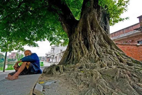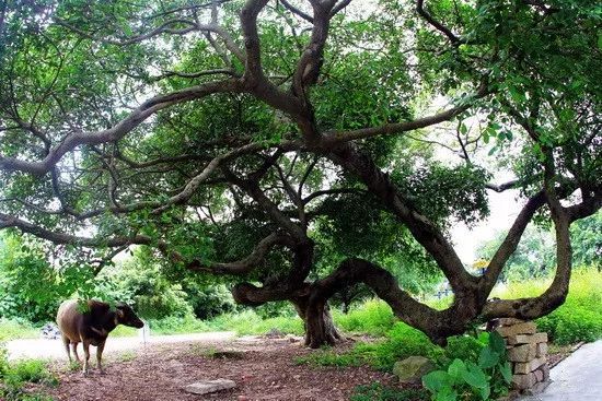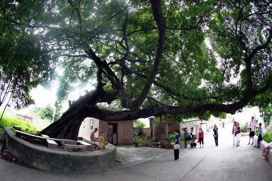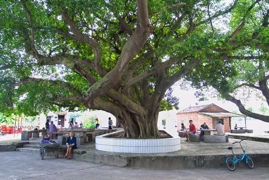 植于小布村前的这颗大叶榕,树龄已近百年,它树干不高,但枝叶茂盛,遮阳面积达400平方米,它挡住日光的炙烤,成为村民纳凉的好地方。