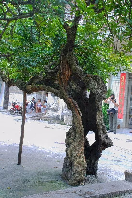 植于汤村街前的这株古龙眼树,树龄达200多年,虽然树干内已腐朽,但它的生命力特强,仍长出多层的新皮将朽木包裹着,而且枝叶茂盛,每年还长出味道极佳的果实,故村民们对它特别加以保护,成为村中一景。