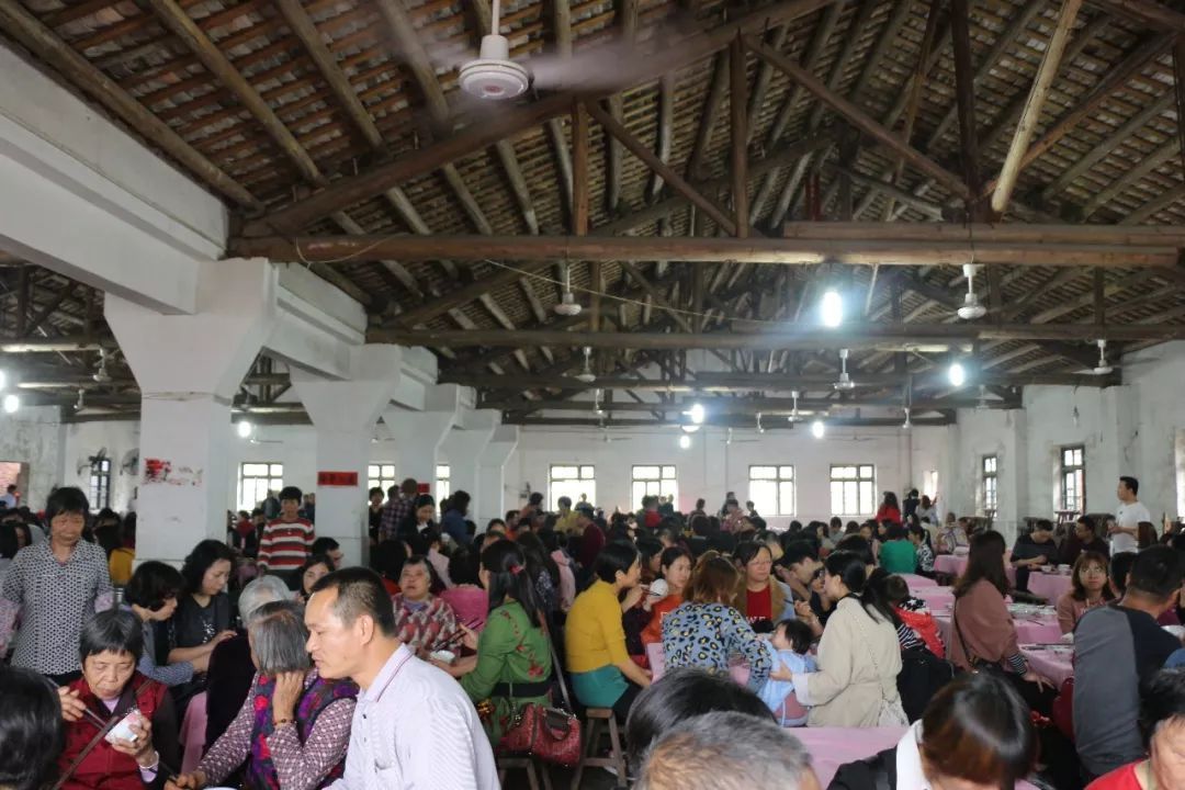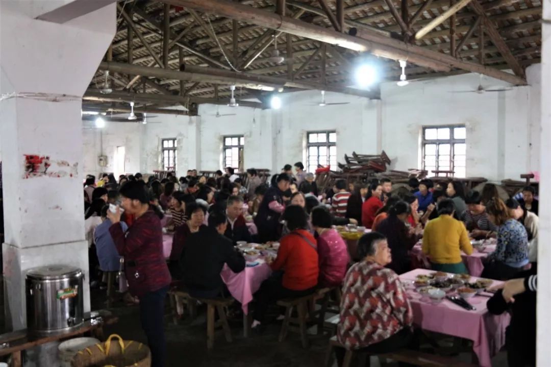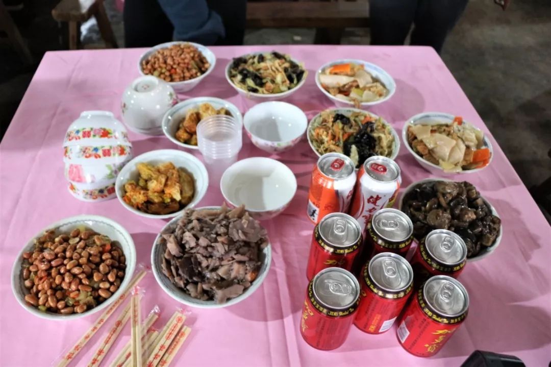 中午时分,苏村庙前祠堂筵开两百席全斋宴,由冬菇、云耳、腐竹、酸萝卜、花生等简单菜式组成的“斋饭”,虽简单但十分讲究。
