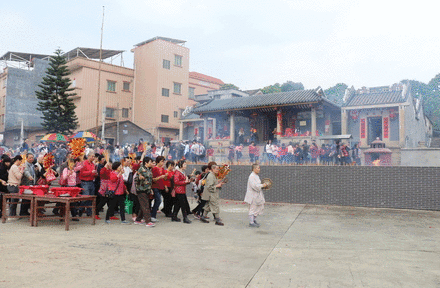 随着木鱼和铜锣敲声的响起,村里两位年长的“斋婆”带领着街坊们在庙前广场上排成数队并列行走。一圈、两圈、三圈......大家以这样的形式,祈求生活幸福、国泰民安。