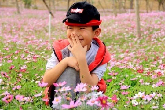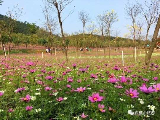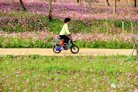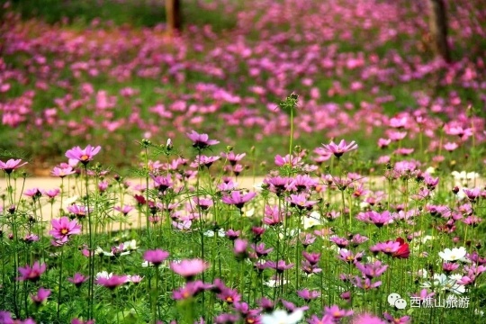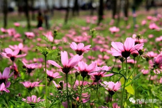 过万株高高低低的波斯菊把整一片绿草淹没。红的、粉的、紫的、黄的花儿随着春风肆意摇曳,将西樵山的山脚点缀成一幅色彩斑斓的水彩画。