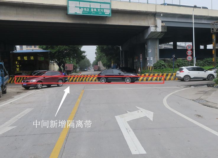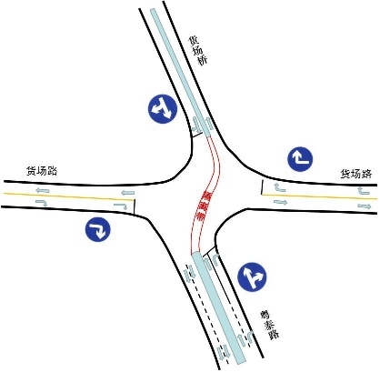 交叉口设置南、北中央隔离带,将北侧货场桥中央隔离带与南侧粤泰路中央隔离带相衔接。货场路东、西进场口车辆,禁止直行与左转,只允许右转;货场桥北进场口、粤泰路南进场口车辆,禁止左转,只允许直行与右转。