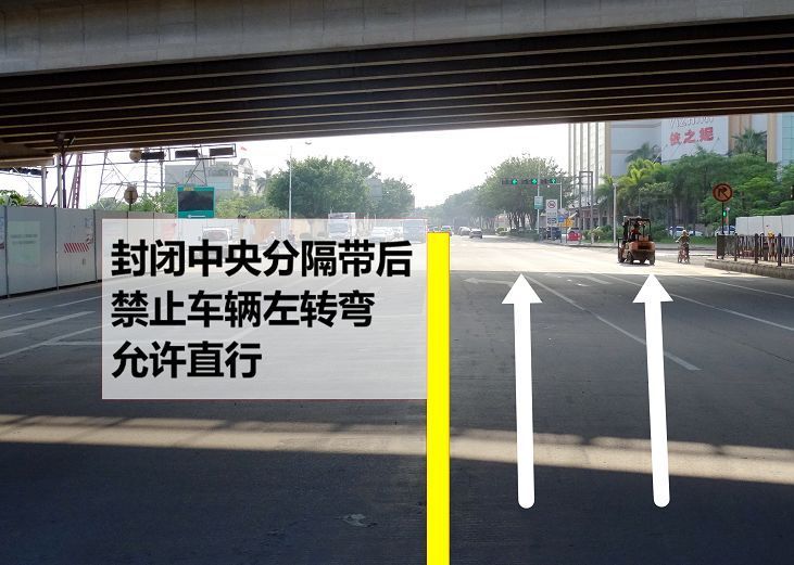 由西往东方向行驶的车辆允许往东直行和往南右转,禁止往北左转,往北车辆需直行至盐步大道路口绕行。