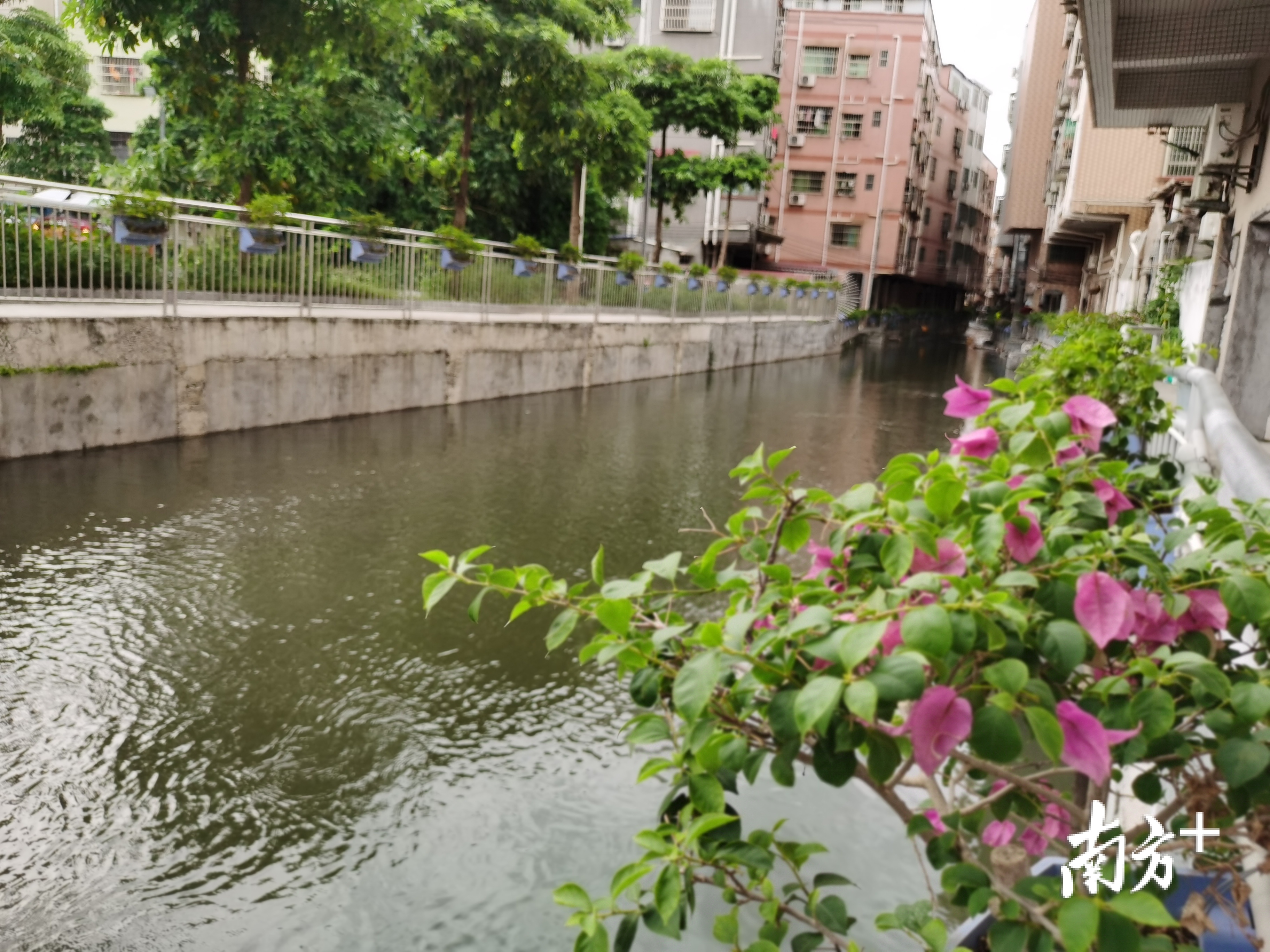 河涌两岸开展碧道建设,摆挂簕杜鹃、矮牵牛等时花。