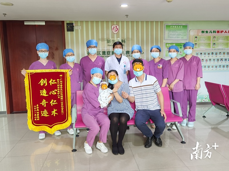 “我真是太感谢医护人员了,宝宝出生时很担心,真是太小了,现在宝宝能够健健康康地回到我们身边,这一切太不容易了!”2021年6月8日,谭女士及丈夫将一面写着“仁心仁术、创造奇迹”的锦旗送到广州市番禺区妇幼保健院新生儿科杨基龙主任的手中。