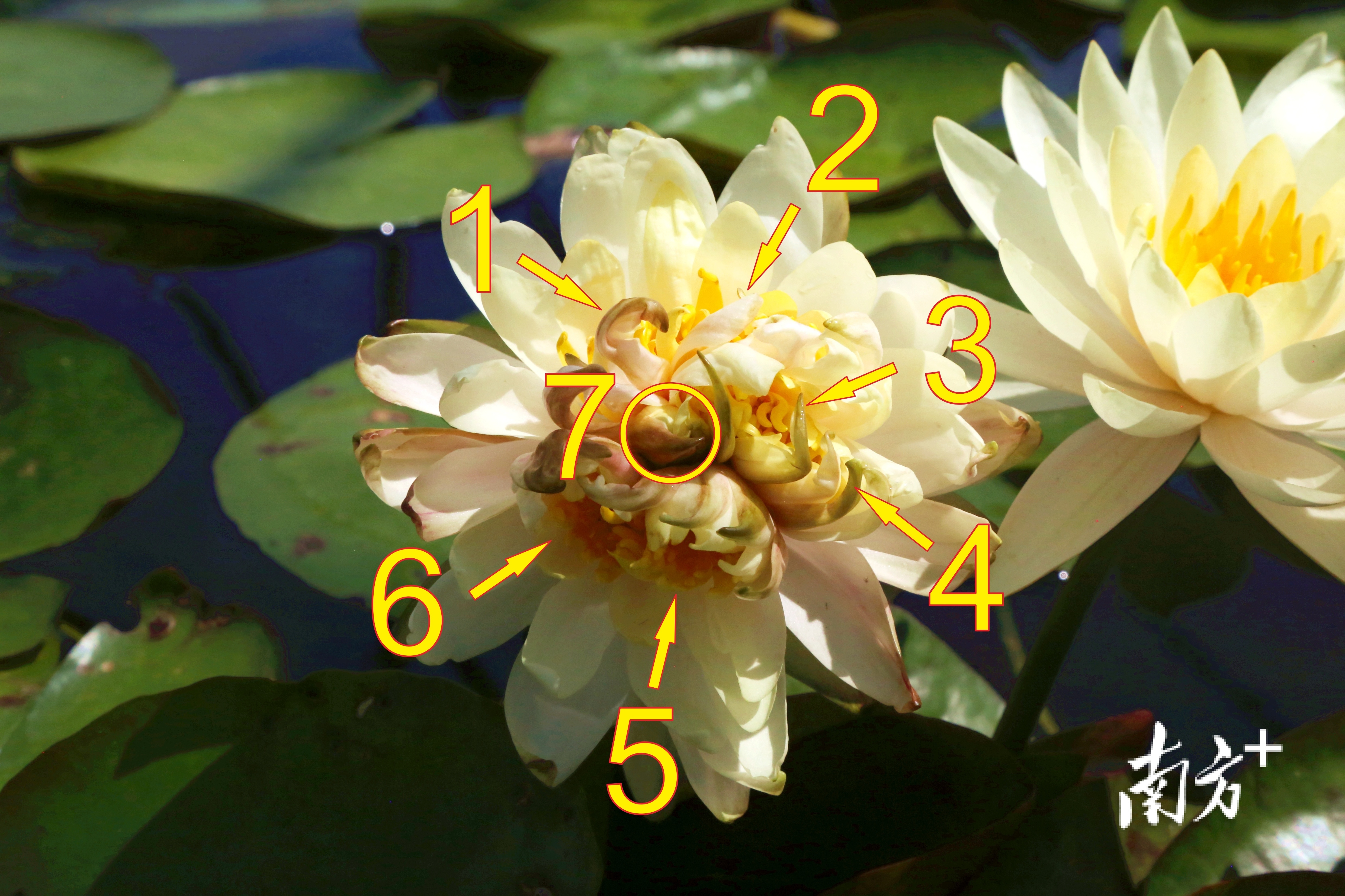 广州番禺莲花山景区宣传负责人张发俊介绍,本次发现的“七芯睡莲”与2020年7月发现的且获吉尼斯世界纪录认证的七蒂睡莲相比,其形态、结构等完全不同:去年发现的七蒂睡莲是同一花柄生长出七朵独立的花朵,同柄不同蒂不同冠,即一柄七蒂七芯七花,是“花并花”;而本次发现的“七芯睡莲”长出的七个花芯共享最外面同一花冠,同柄同蒂同冠,即一柄一蒂七芯,是“花中花”。