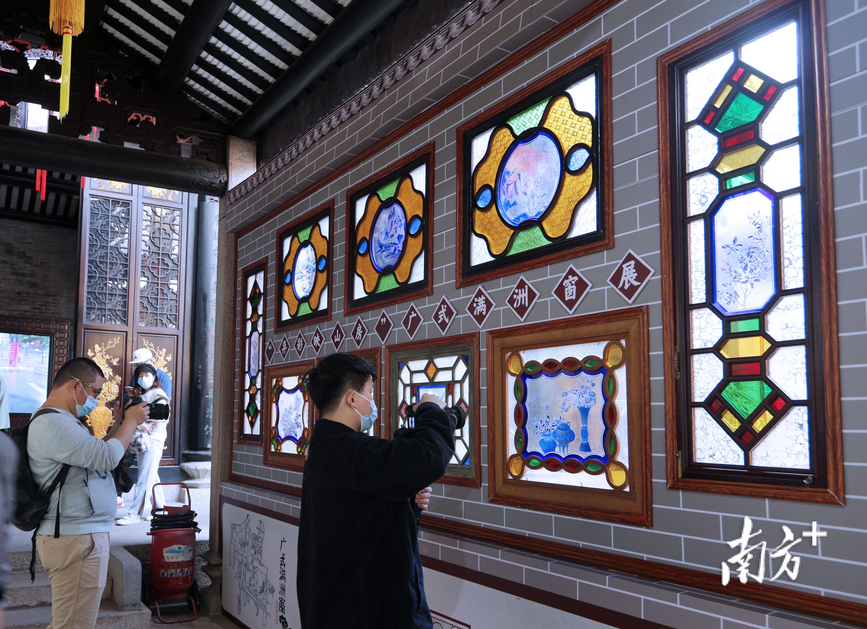 除了菊展外,园内还设置了“异彩映山房”广式满洲窗展。满洲窗是珠江三角洲一带的民居和庭院建筑专用的窗户形式,是用传统的窗棂(木框架)镶嵌着彩色玻璃组成的窗子,其中彩色玻璃为西方进口所得。余荫山房深柳堂的栀子花套岭南花果茭荷彩色窗、瑜园的“蝶恋花”“木棉花”满洲窗均为其代表。为了让游客能够更加直观地了解满洲窗的内涵与韵味,1月20日开始,余荫山房在善言邬公祠内展出佛山市满洲玻璃工坊有限公司制作的满洲窗数面,展览会一直持续到2月底。