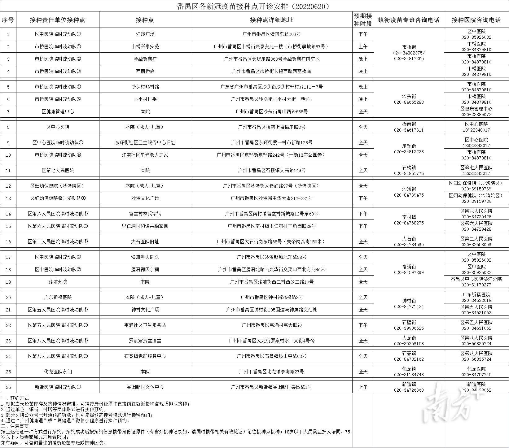 6月20日,番禺区各镇街部分区域将开展常态化免费核酸检测,具体安排如下:(部分采样点可能会因为天气等原因临时取消,以现场安排为准)