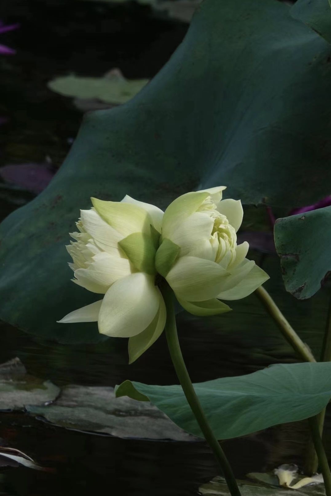 “这朵并蒂莲品种为‘林亭春霭’,外层花瓣宽大,内层花瓣细长,着花繁密,花态规整,从花开到花落,始终保持浓郁的黄绿色,比较少见。这朵并蒂莲的花期会持续2~3天左右。”景区园艺师傅介绍道。