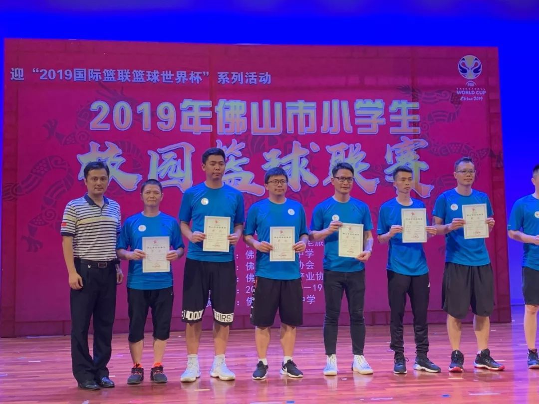 碧桂花城王在和(左四)及新圩小学钟杰获2019年佛山市小学生篮球赛优秀教练员称号。