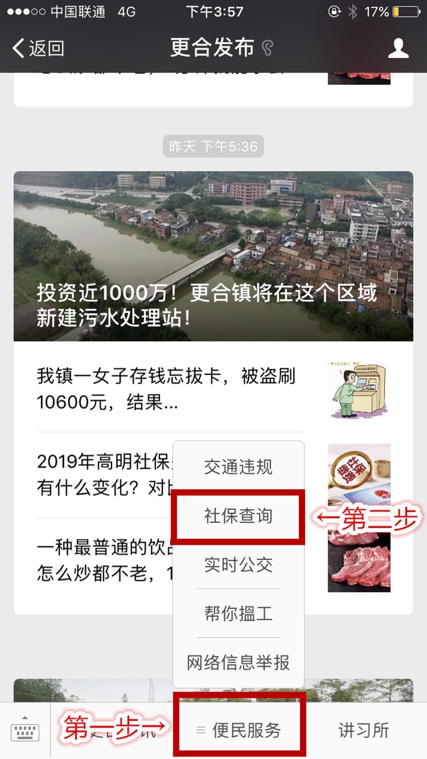 2.关注后进入对话界面,点击菜单栏中的“便民服务”,再点击“社保查询”。