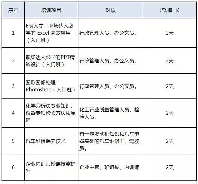 (三)课程安排:从2月份开始,每一项目课程各安排一期,具体课程安排详见附件2。如培训时间有临时调整的,由市职业训练指导中心通知各参训单位。