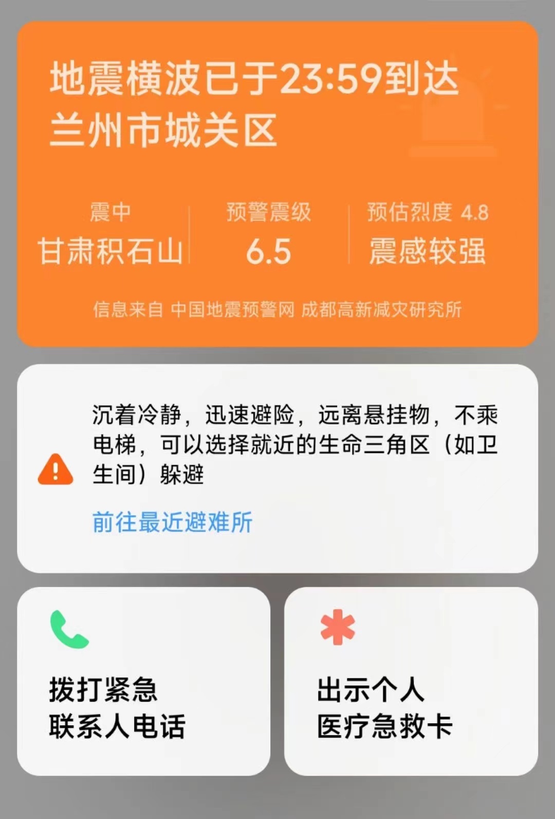 地震发生后,兰州、庆阳、平凉、天水、陇南、定西、武威、金昌等地均有明显震感。不少网友都收到了来自手机的地震预警。