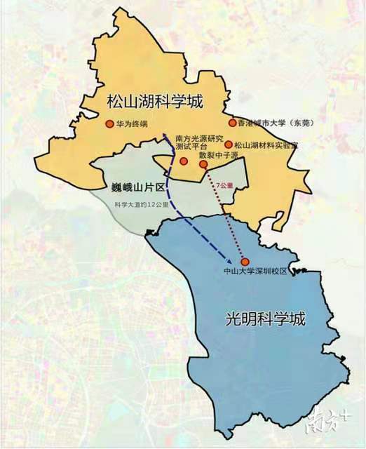 目前,松山湖科学城已逐步构建“源头创新、技术创新、成果转化、企业培育”的全链条全要素创新体系。其中,在中科院支持下,中国散裂中子源、松山湖材料实验室及众多新型研发机构等创新平台建成使用并已收获累累硕果。而在距离松山湖科学城直线距离不过7公里的地方,深圳综合粒子研究院、深圳神经科学研究院等8大项目已集中入驻光明科学城。