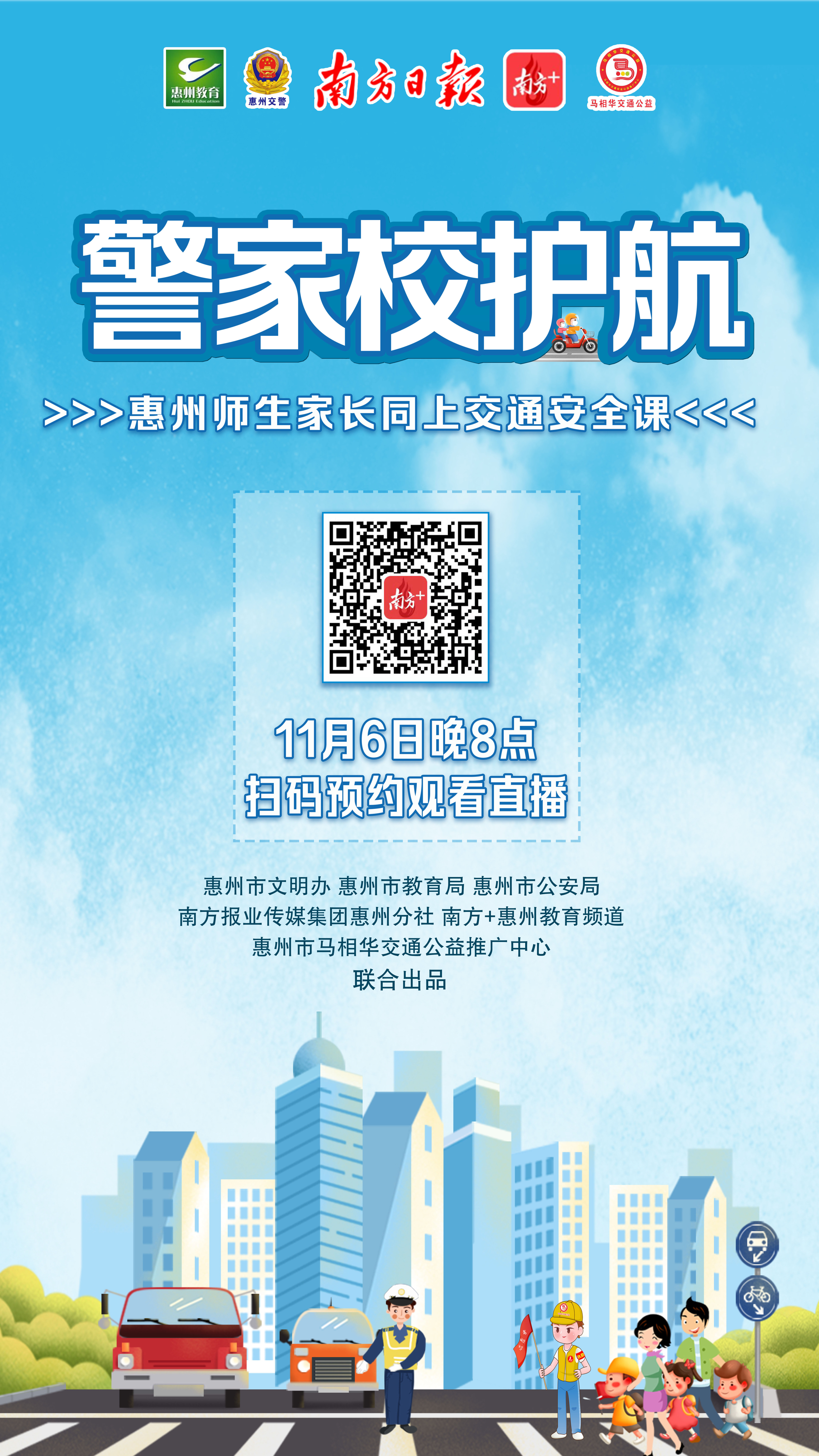 11月6日(本周六)晚上8时,惠州市文明办、惠州市教育局、惠州市公安局、南方报业传媒集团惠州分社、惠州市马相华交通公益共同推出的“警家校同行 出行更文明”交通安全课将与全市师生家长见面,欢迎大家准时收看。