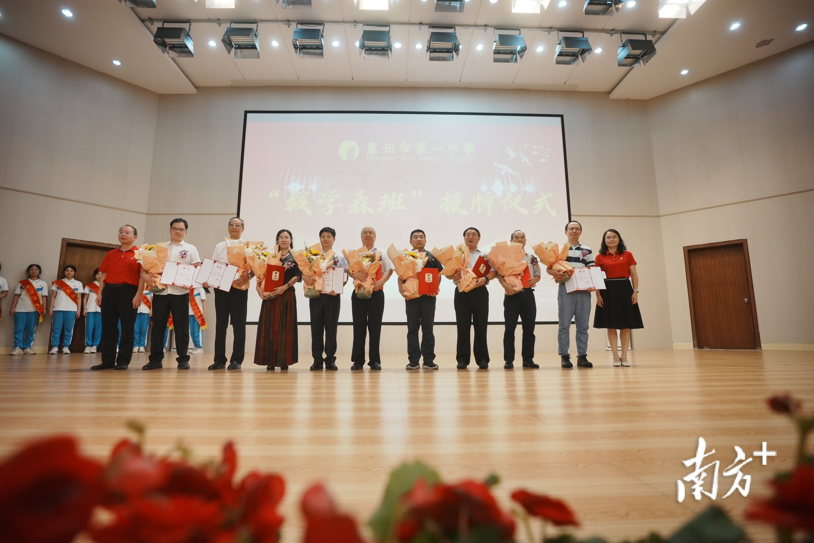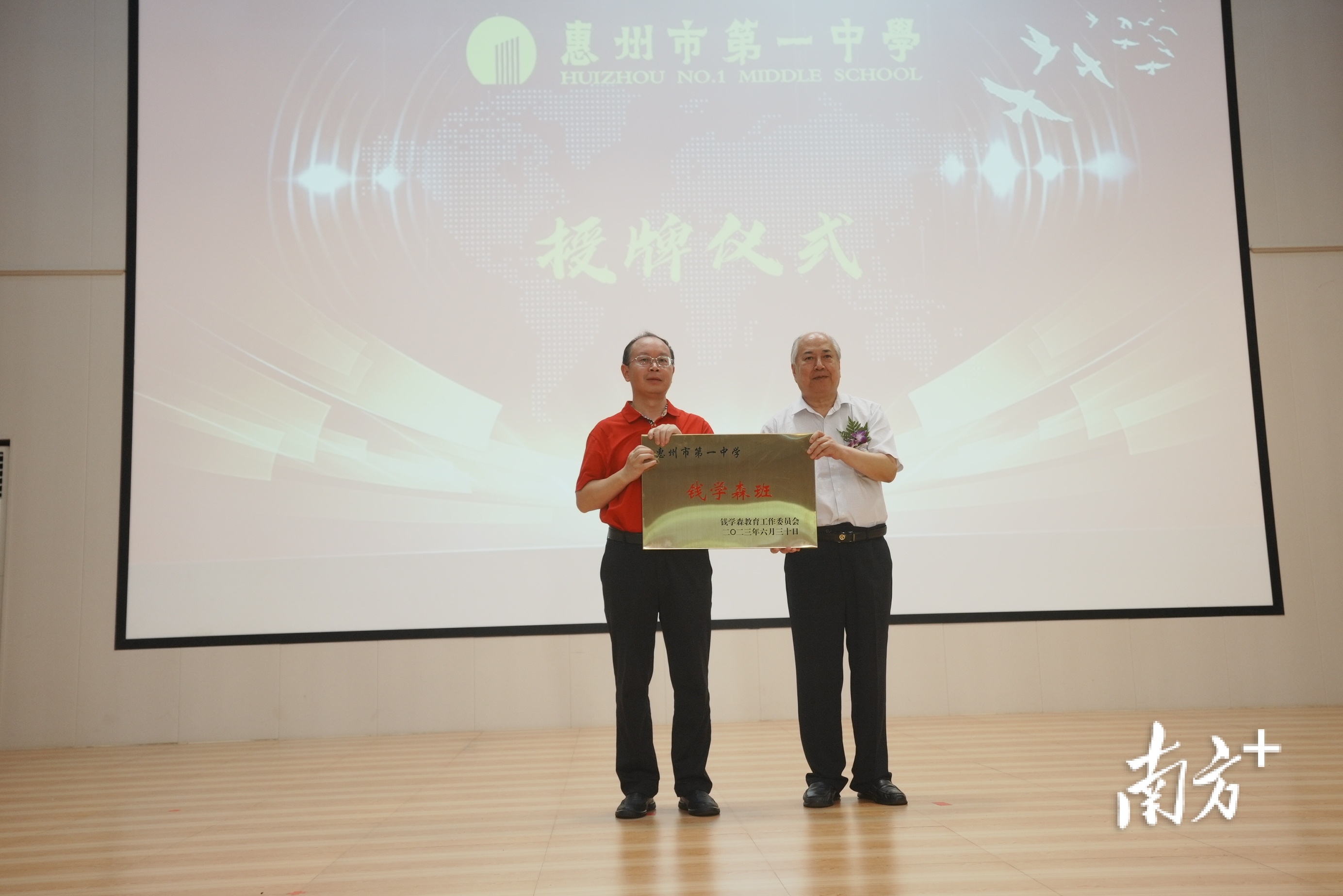 揭牌仪式上,钱学森先生之子钱永刚教授为惠州一中“钱学森班”颁授班牌;惠州市第一中学校长陈平肸为惠州一中“钱学森班”颁授班旗;惠州市第一中学党委书记李海媚、陈平肸为“钱学森班首席专家”颁发聘书。