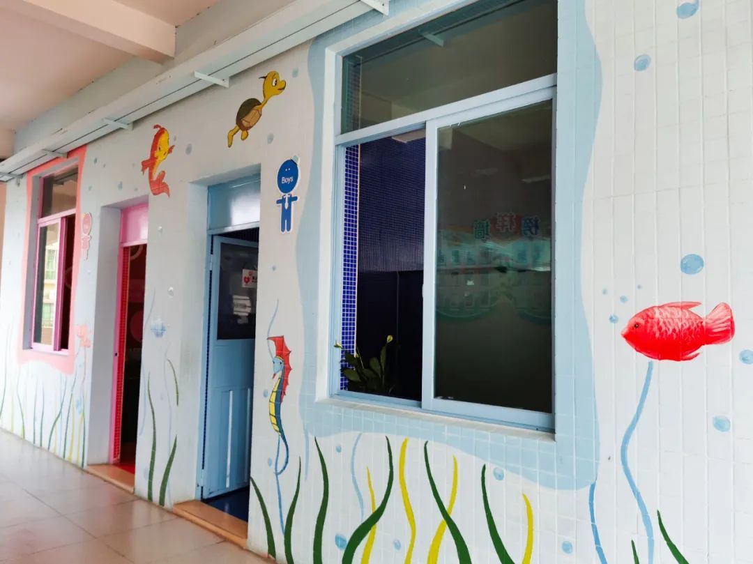 在井岸镇第一小学,走进已改造完成的厕所,当中不但没有异味,装饰更是颇具特色:粉色的女厕和蓝色的男厕格外醒目,形成鲜明的对比,厕所墙壁上精美的彩绘更是吸引眼球。