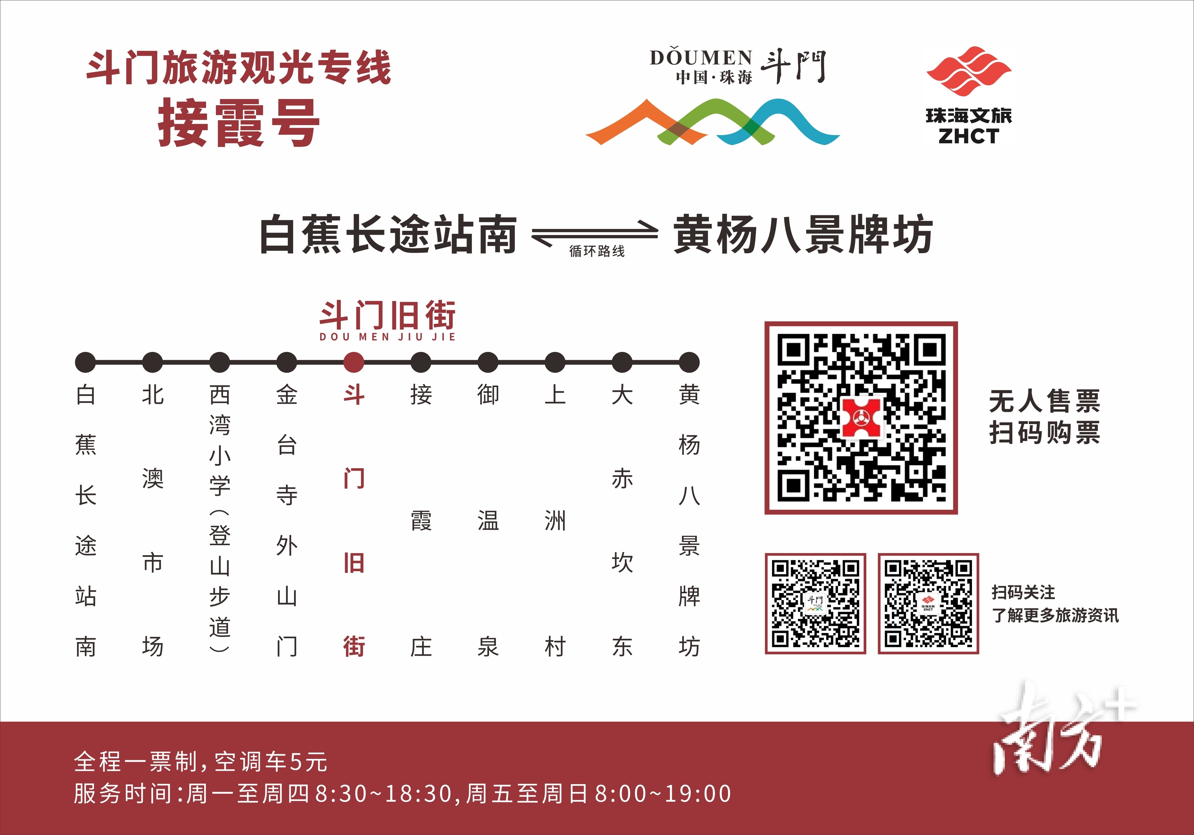 “接霞号”旅游观光巴士彩印着斗门旧街、接霞庄和黄杨山等珠海斗门标志性的旅游景点。该旅游观光专线从白蕉长途站南发车,途径西湾村登山步道、金台寺外山门、斗门旧街、接霞庄、御温泉、上洲村、和黄杨八景牌坊,单程38公里,将“一山一寺一温泉,一皇一将一家族”的独特旅游资源“串珠成线”。