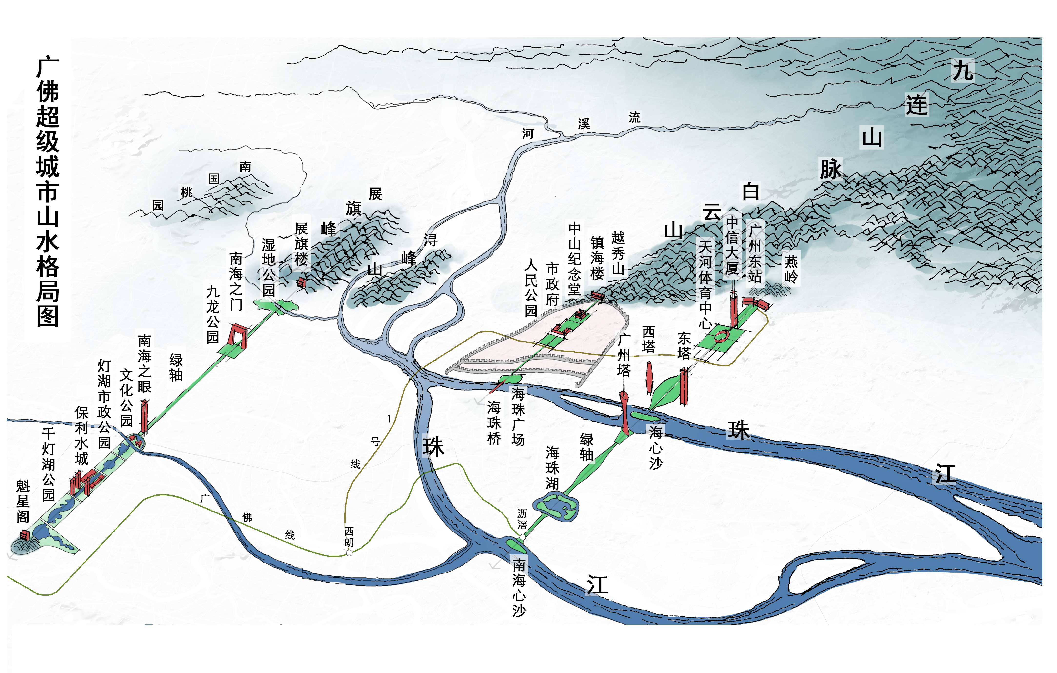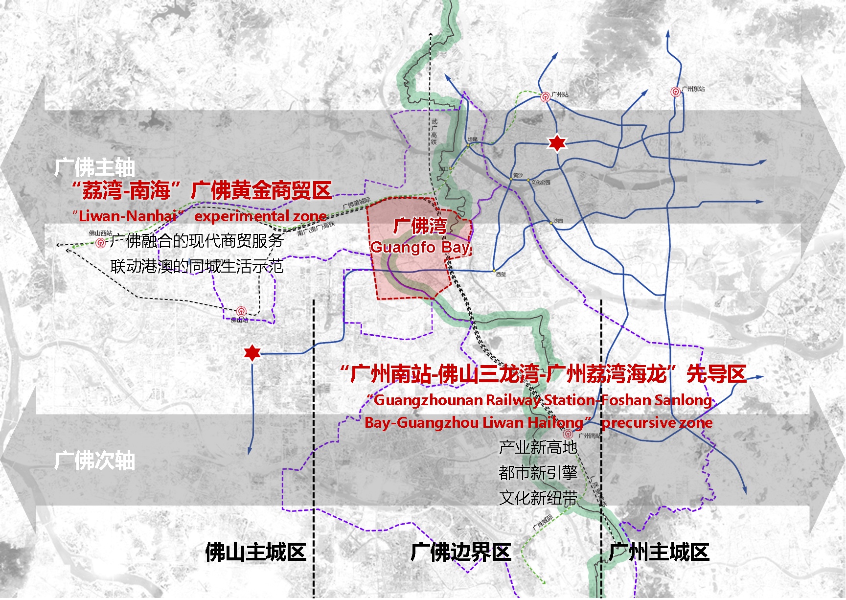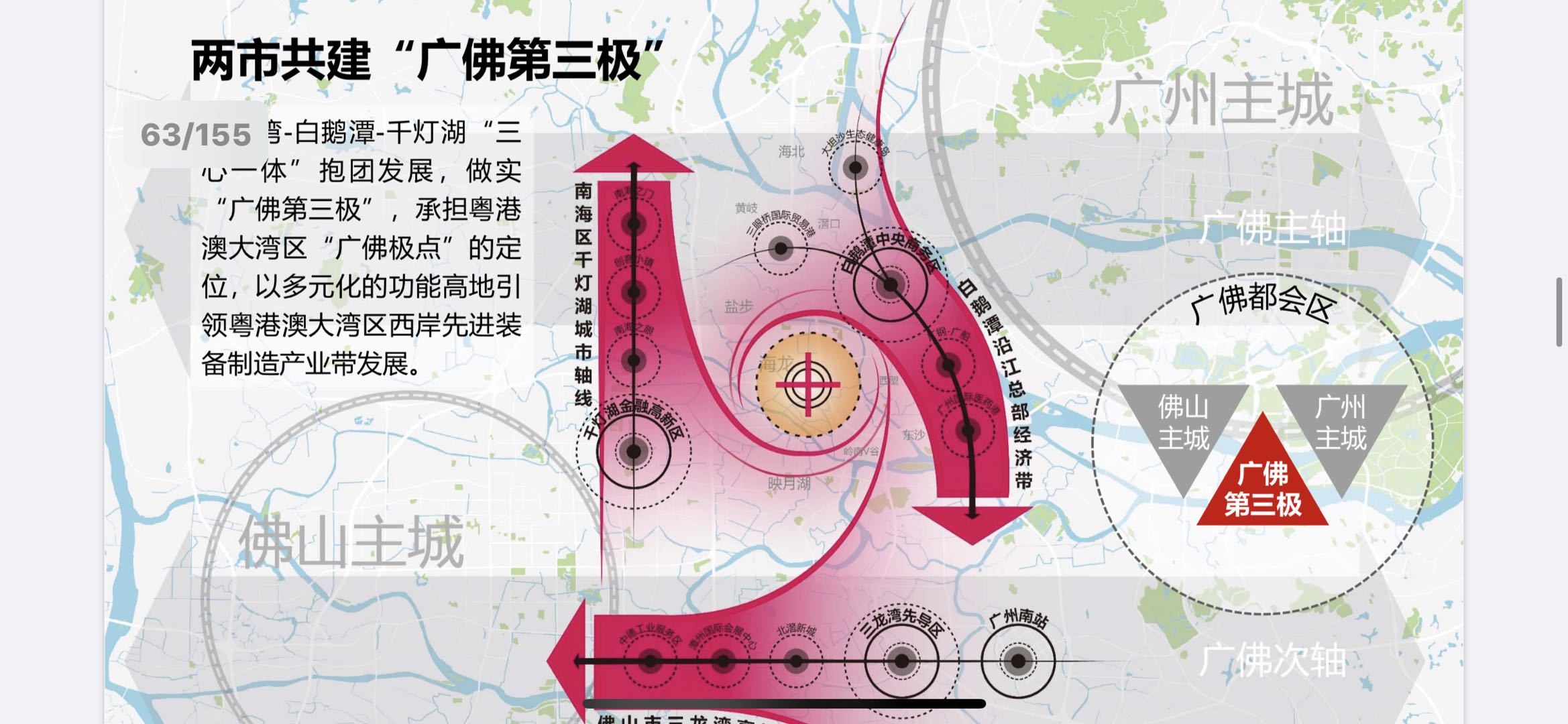而在华南理工大学建筑学院教授袁奇峰看来,广佛湾的建设还发挥着连接广州白鹅潭CBD、佛山三龙湾、南海千灯湖金融高新区三大重点平台,通过“三心一体”,构筑“广佛之心、湾区极点”的枢纽功能。