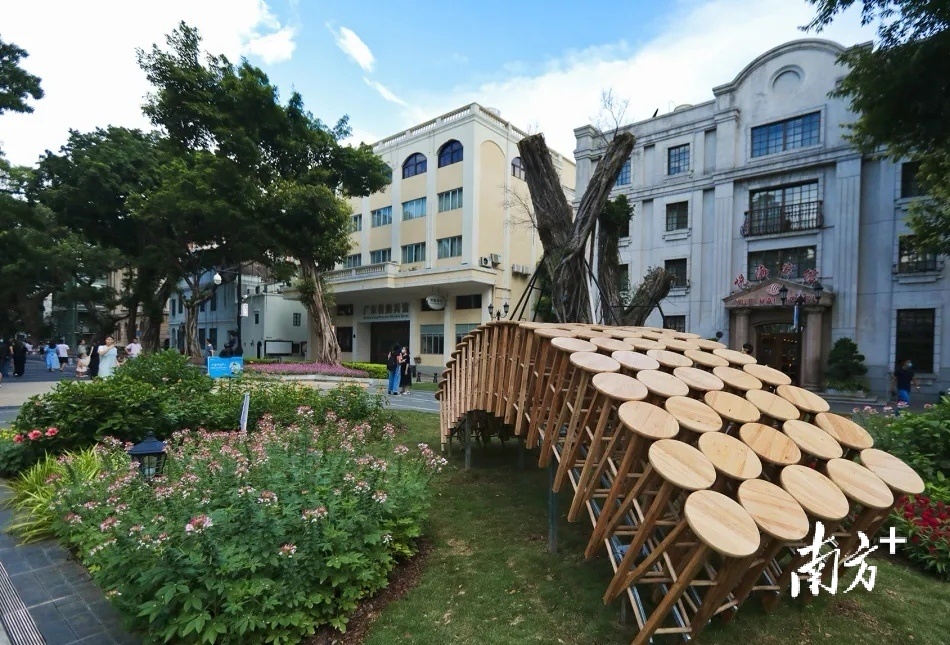 广州西,白鹅潭三江交汇,阔水连天。沙面岛上,现代与历史碰撞交融,一件件天马行空的当代艺术作品,吸引了大批市民前来打卡。
