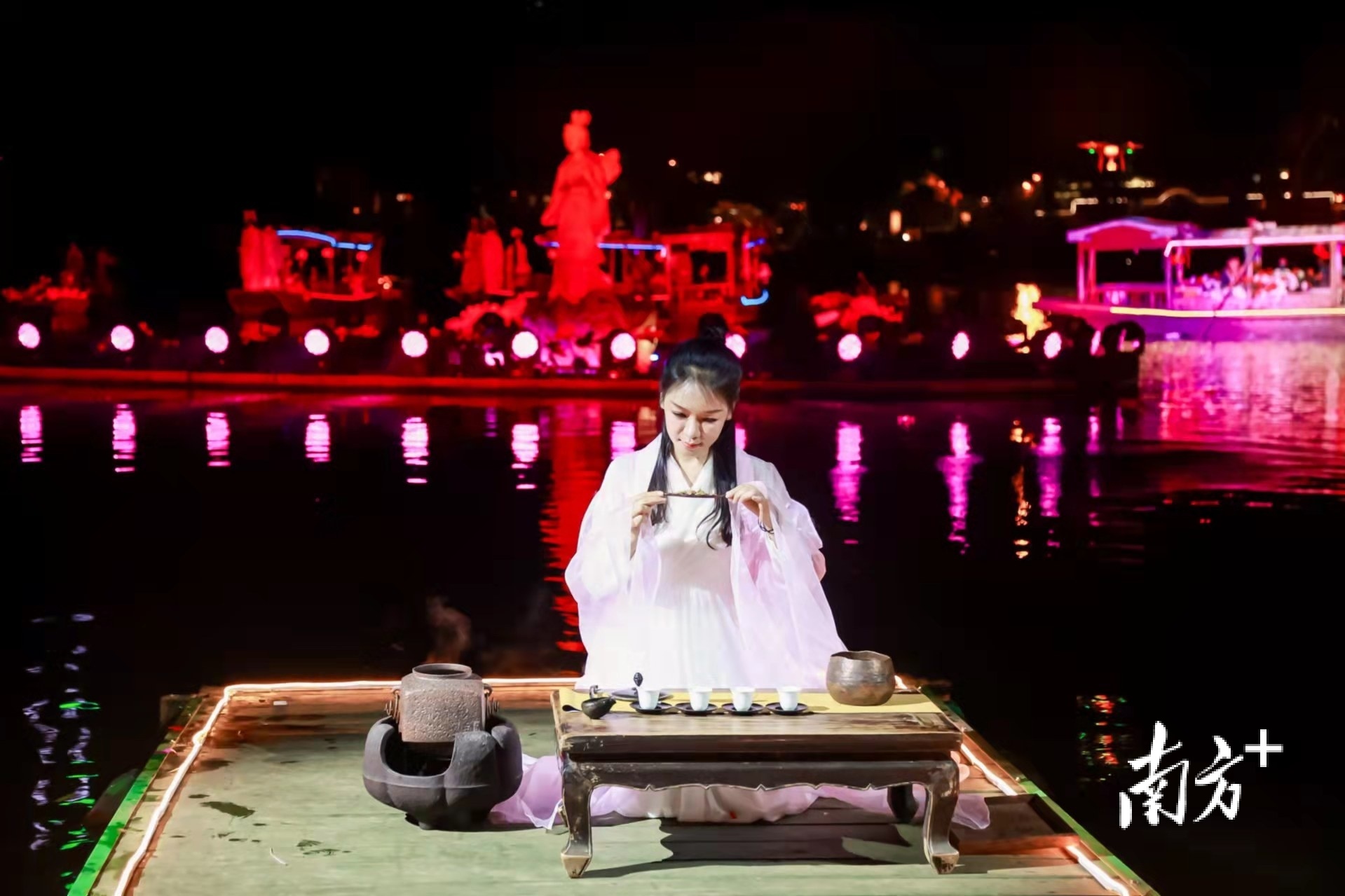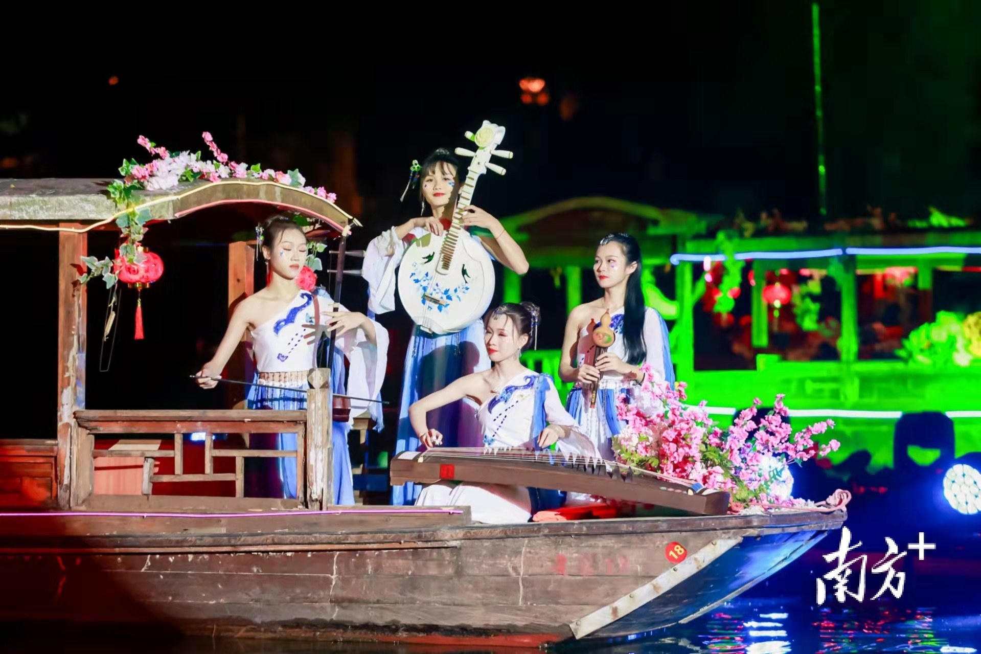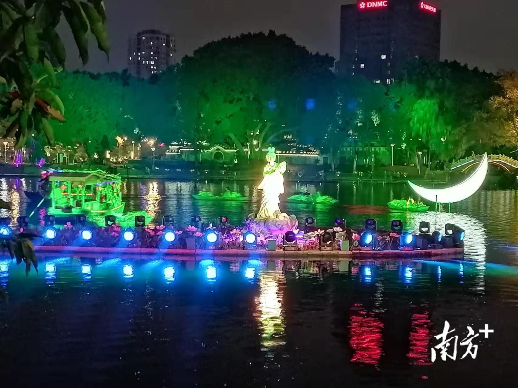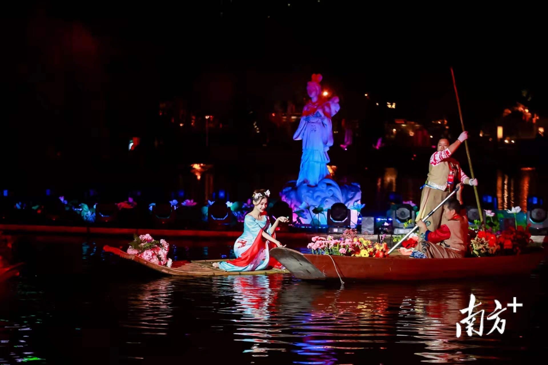 水岸流光,濛濛水雾夹杂着悠扬粤韵,今夜的荔湾湖畔更加诗意灵动。在一曲《荔湾渔唱》中,湖面上再度演绎着旧时水上花墟的情景。一艘艘花艇轻盈地浮水而来,湖面四溢着芬芳。
