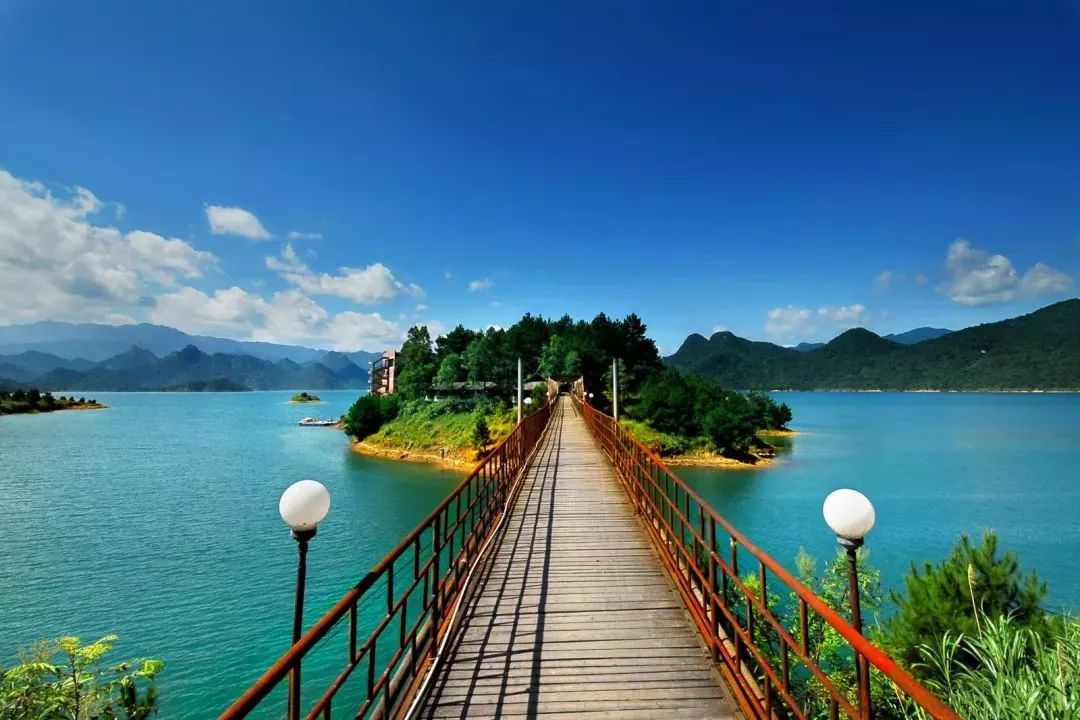 湖中有12个岛屿,如12块翡翠镶嵌在南水湖上。南水河古称洲头水,洲头タ照。清晨云蒸霞蔚,中午碧波荡漾,黄昏流光溢彩,实乃人间之天堂。