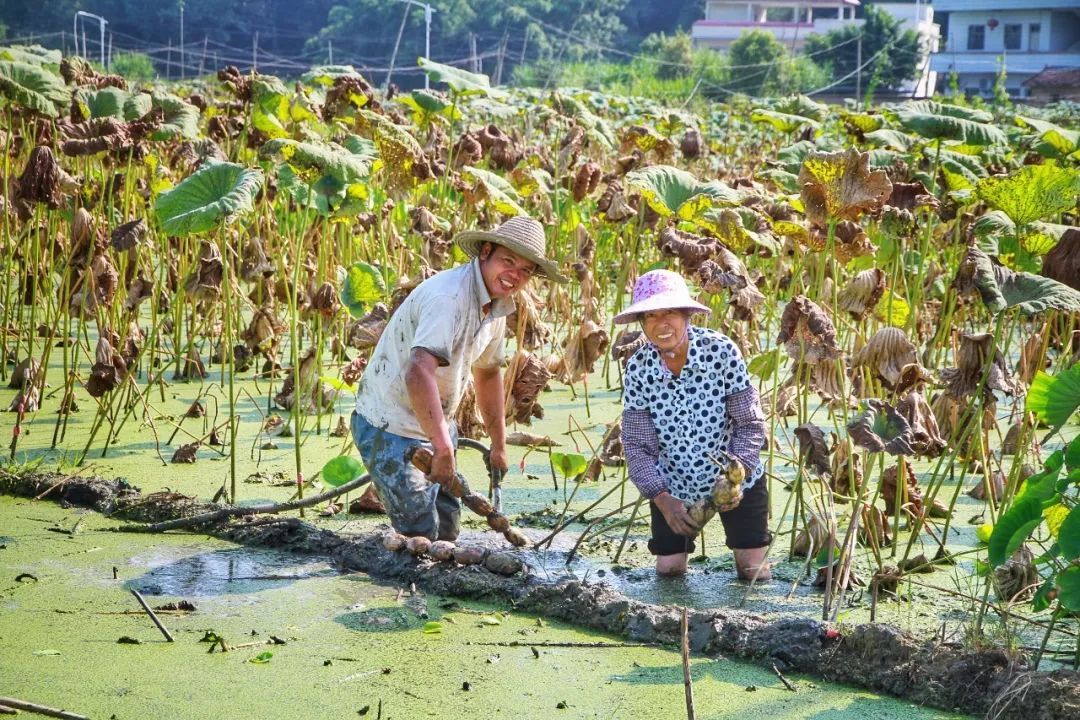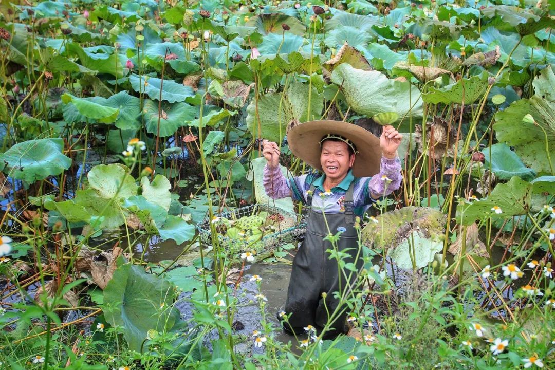 ▲重阳镇的农户正在自家荷塘采摘莲藕。陈励 摄