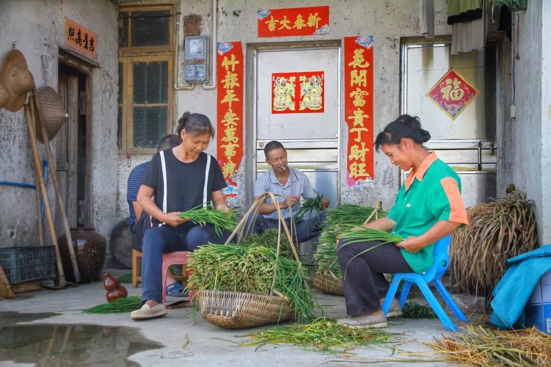 ▲武江区龙归镇山前村,几位村民坐在一起脸上挂着欣喜的笑容在家中分拣刚采摘的韭菜。 陈励 摄
