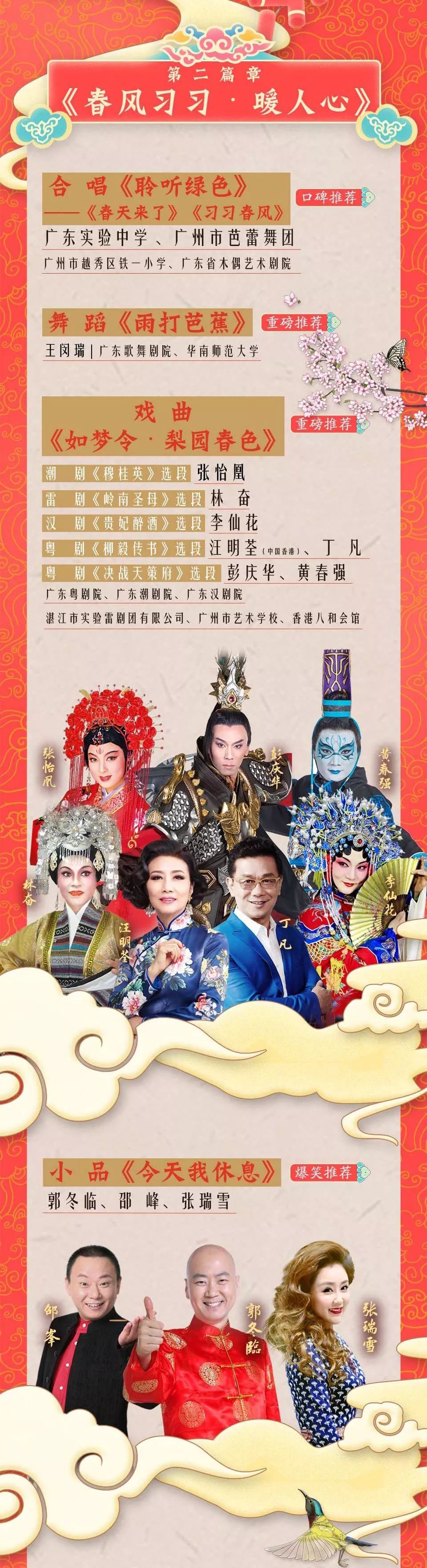 此次约有1200名演职人员参与春晚的筹备工作,集合了广东歌舞剧院、广州歌舞剧院、广州芭蕾舞团、广东省木偶艺术剧院、广东粤剧院、广东潮剧院、广东汉剧院、华南师范大学、广东实验中学的“冠军级”合唱团等省内艺术团体精英力量;广东广播电视台派出强大主持阵容,王鹏、郭蕾、杜伟、邓璐、申兴华、李琳、宋嘉其、李佳、伍燕、曾文翰、林彬,内外场联动,全力以赴向全国观众展现广东文艺界的最高水平!