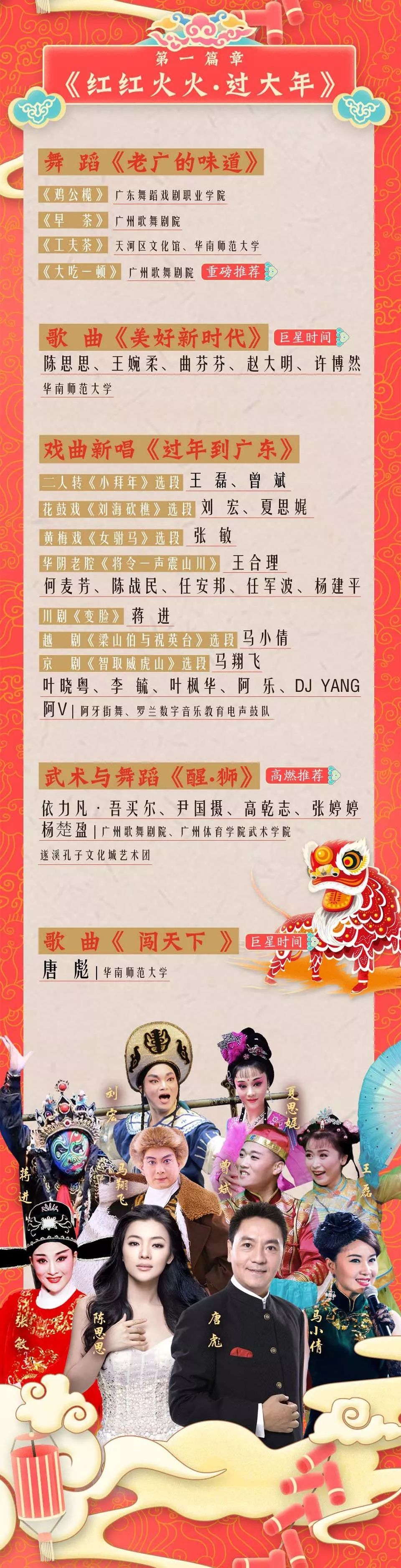 晚会分为五个章节,分别是“序曲:《开门大吉》”“第一篇章:《红红火火·过大年》”“第二篇章:《春风习习·暖人心》”“第三篇章:《滔滔潮涌·再扬帆》”“尾声:《新时代·再出发》”,遵循着“欢乐过大年—抒发自豪感—新春再出发”的叙事主线,以广东“民俗、民情、民风”为依托,展示广东“业绩、事迹、奇迹”,抒发人民群众的“幸福感、获得感、安全感”,呈现一场粤味浓郁、年味十足的文化大餐,吹响广东“新春再出发”的集结号,为打造活力广东、幸福广东、智慧广东不懈努力。敬请广大市民关注和收看。