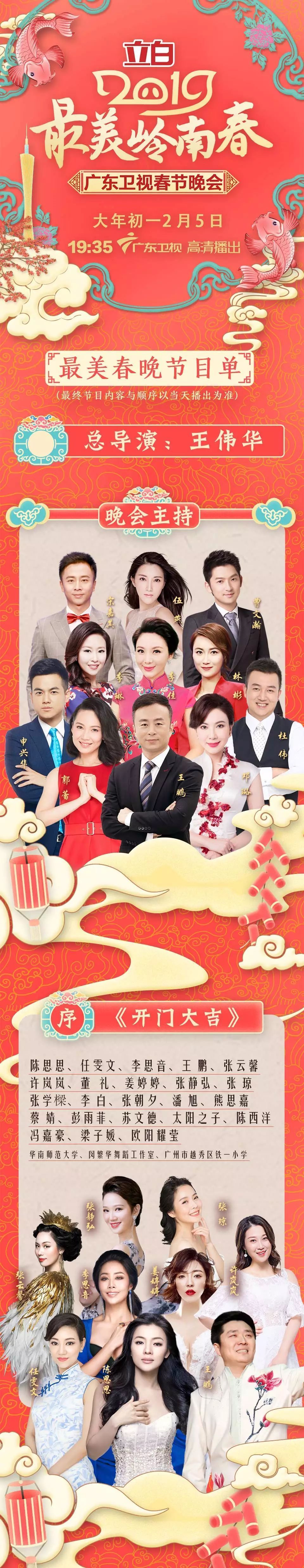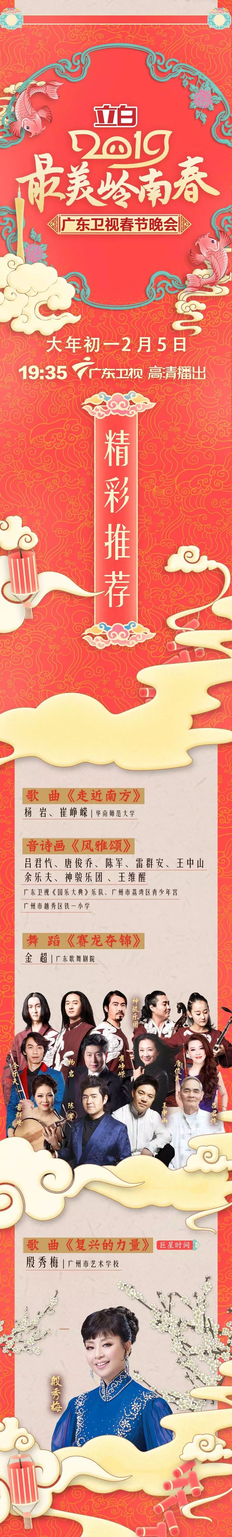 由广东广播电视台打造的《最美岭南春——2019广东卫视春节晚会》,将于2月5日(年初一)19∶35,在广东卫视和全国观众一起过个粤味十足的幸福年。殷秀梅、谭维维、戴玉强、莫华伦、魏松、汪明荃、李克勤、陈思思、郭冬临等演艺嘉宾领衔唱响美好生活欢乐颂,劲歌热舞、舞蹈武术、戏曲小品等多元节目精彩纷呈,带来一场喜庆吉祥的新春合家欢。