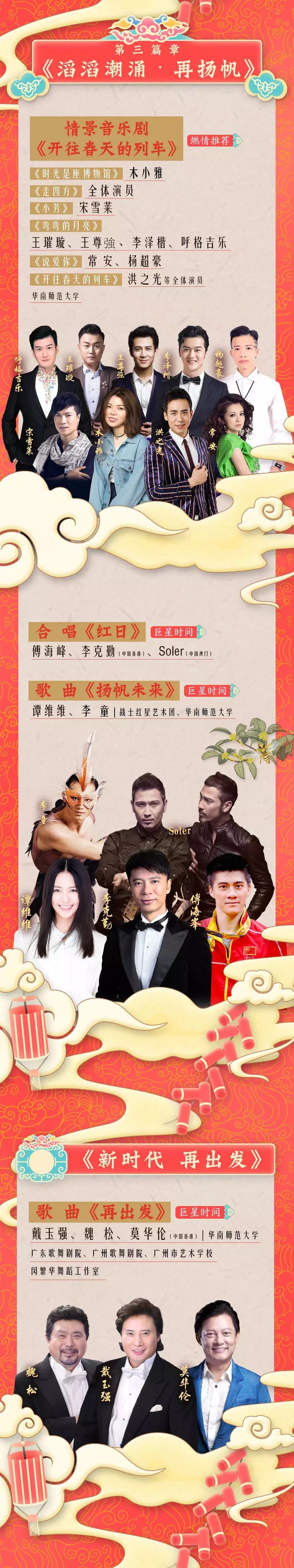 歌曲《再出发》,是为本场晚会量身定制的主题曲,曲中蕴含着广东包容开放的时代精神、昂扬向上的前进动力。作为压轴节目,中国三大男高音戴玉强、魏松、莫华伦同台,唱出欣欣向荣的新广东,并表示粤港澳大湾区的高速发展让他们感到振奋和期待,还笑称“以后我们三个就在广东住下不走了。”