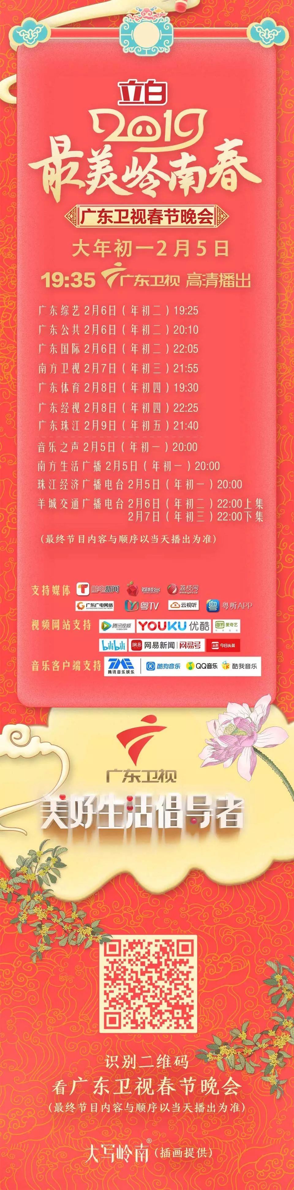 这场具有岭南风味的开年“喜”宴,将在触电新闻、荔枝台、荔枝网、腾讯视频、优酷、爱奇艺、哔哩哔哩、今日头条、广东iptv、云视听、广东有线电视、粤听等平台播出;同时会在触电新闻、网易新闻客户端、微博、秒拍、今日头条、西瓜视频、抖音、微视等短视频平台上线精彩集锦,全网跨屏联动,让更多海内外观众和网友,一同感受最美岭南春!