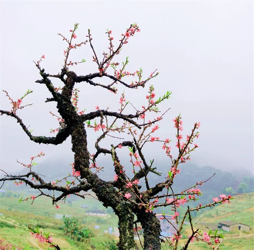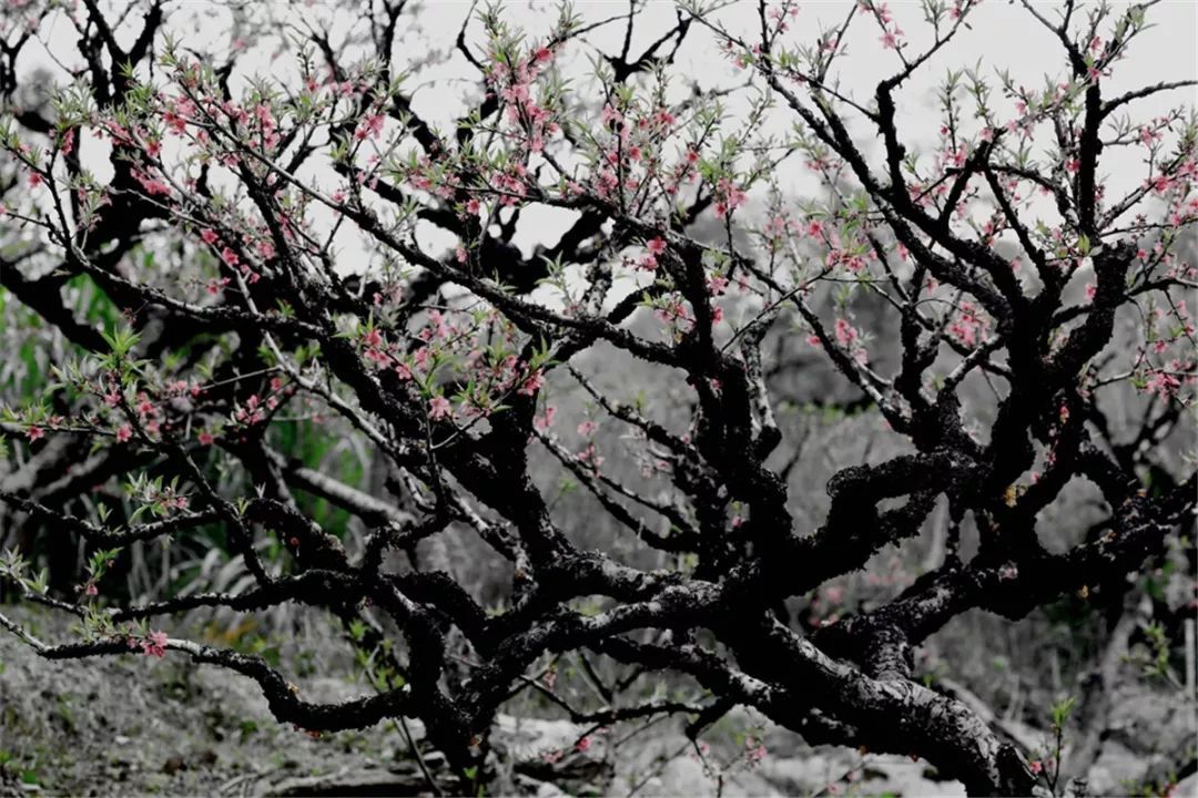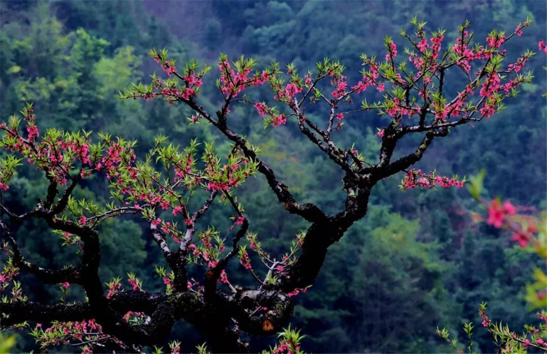 李洞村桃花谷的桃树长于山谷之中,顺着两边山坡盘虬而上,苍劲写意,放眼望去,桃红浸染整个山谷,那山那树那花构成了一幅浓烈洒脱的水墨画。