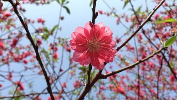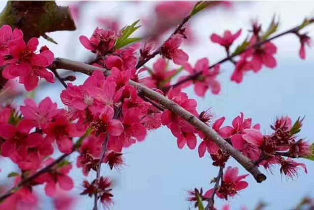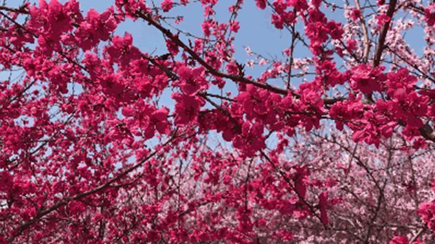 衬着蔚蓝的天空,枝头的娇羞粉色犹如女子害羞时的脸颊,馨香四溢,令人宛若置身于仙境。