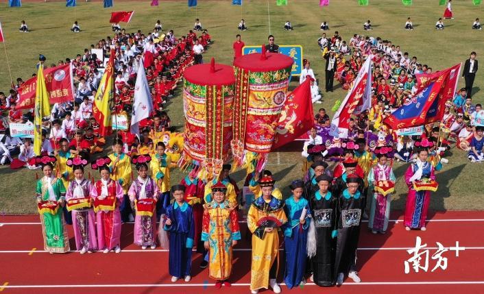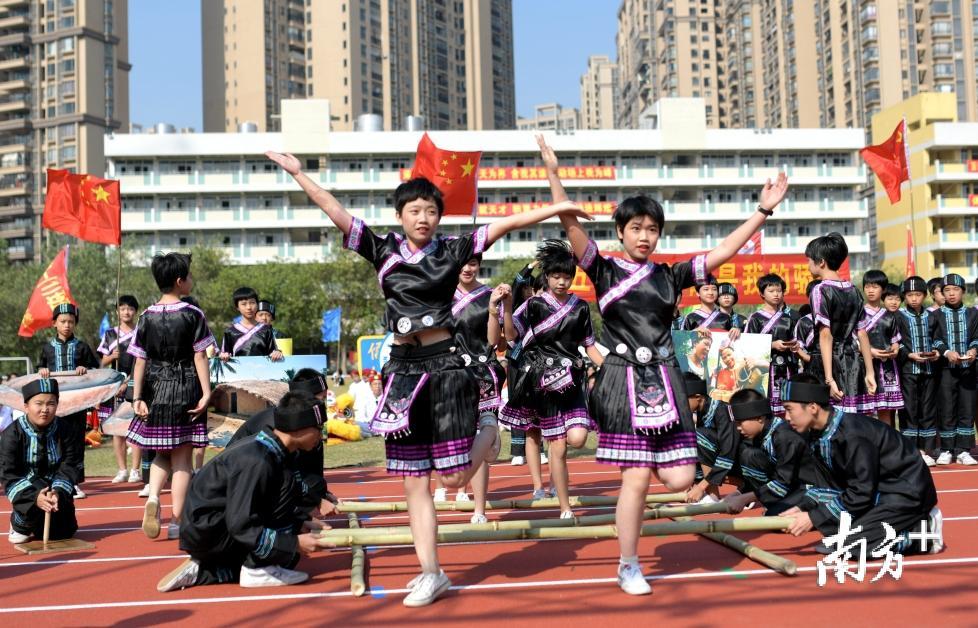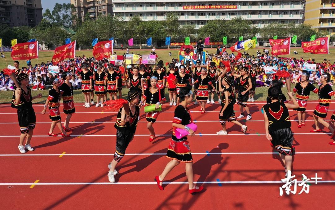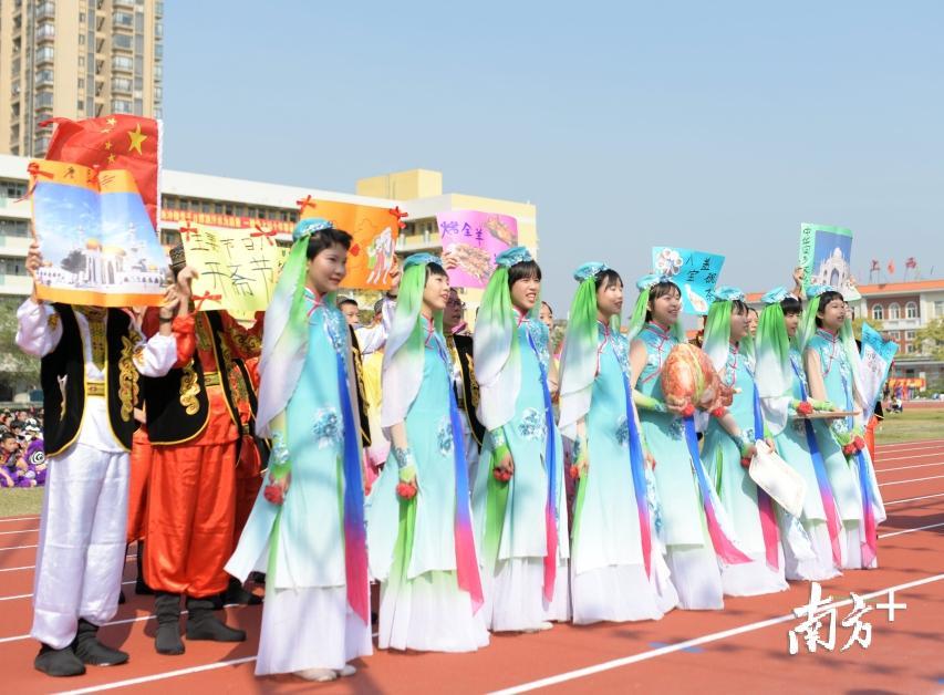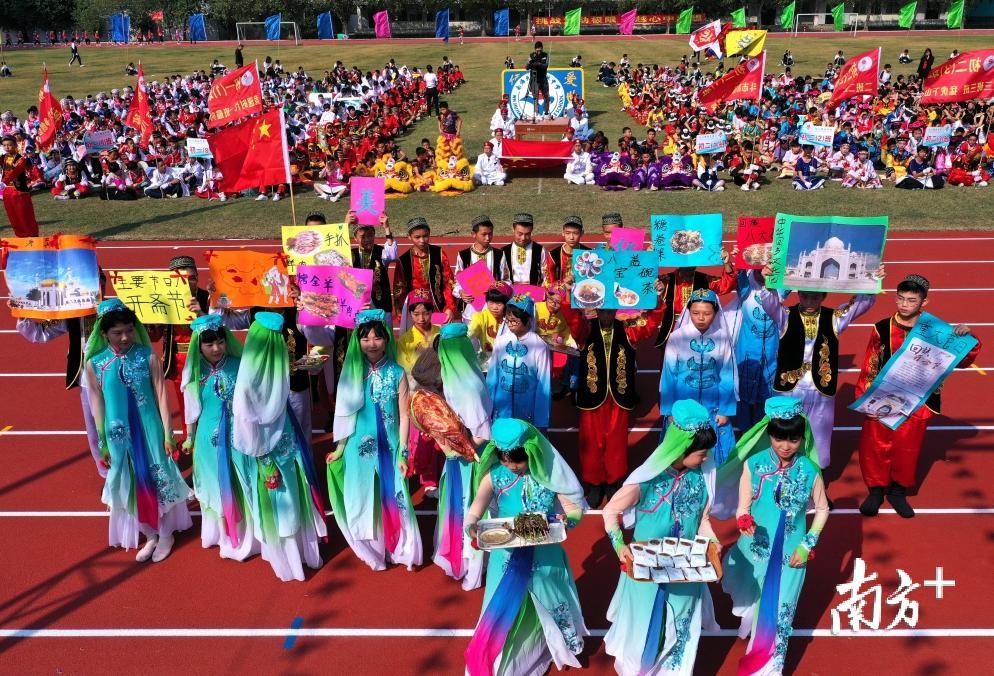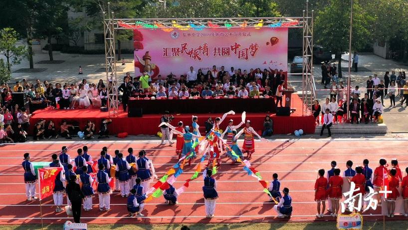 11月7日,南海区九江镇儒林中学举办“汇聚民族情,共圆中国梦”2019年体艺节开幕式,学校学生身穿彝族、满族、羌族等我国少数民族的服饰进行节目表演,展示我国少数民族的风俗文化。