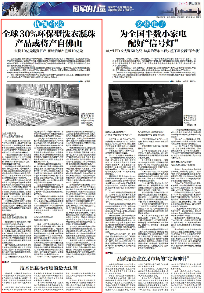 如今,优凯科技生产的洗衣凝珠产品在日化行业的销售中占全国市场50%以上。随着企业的增资扩产,优凯科技力争在2021年产销超10亿元,成为佛山独角兽企业。