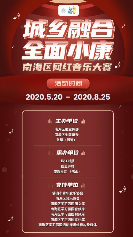 为进一步扩大南海区网红经济发展势头,提升南海区网红城市知名度,增加南海区城乡融合改革发展试验区发展成果及特色城市地标、文化旅游产业的曝光率,提升南海区网红城市的知名度和影响力。由南海区委宣传部联合南海区改革办、各镇街共同推出“城乡融合、全面小康 ——南海区网红音乐大赛活动”的即日起正式启动。