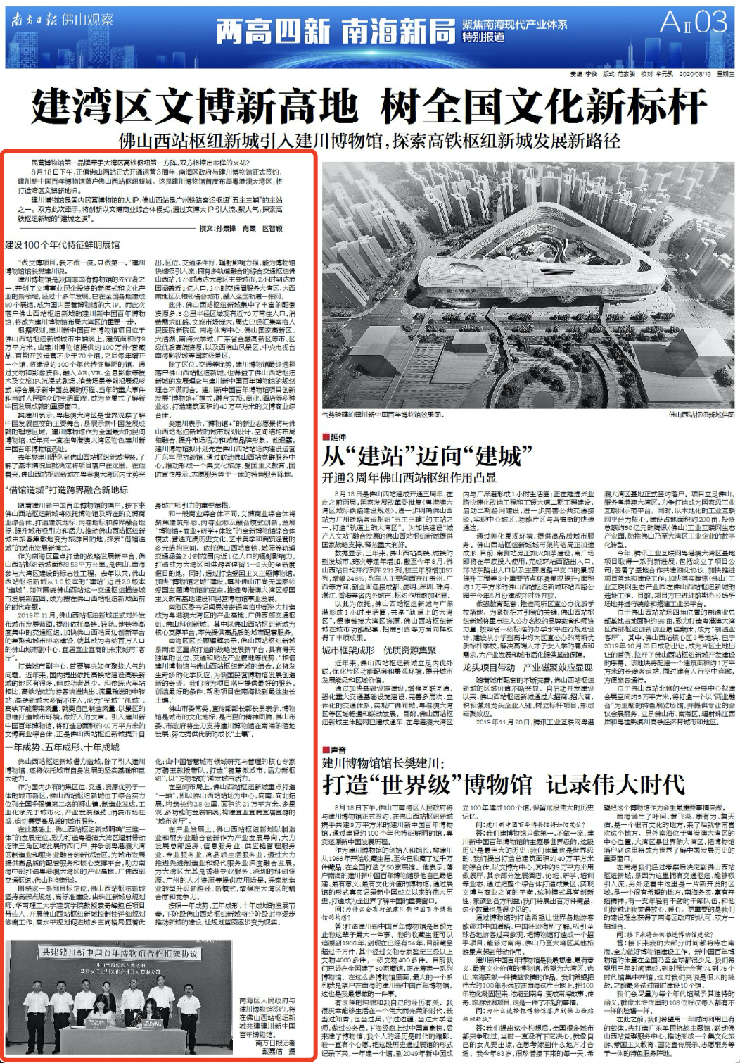 8月18日下午,正值佛山西站正式开通运营3周年,南海区政府与建川博物馆正式签约,建川新中国百年博物馆落户佛山西站枢纽新城。这是建川博物馆首度布局粤港澳大湾区,将打造湾区文博新地标。