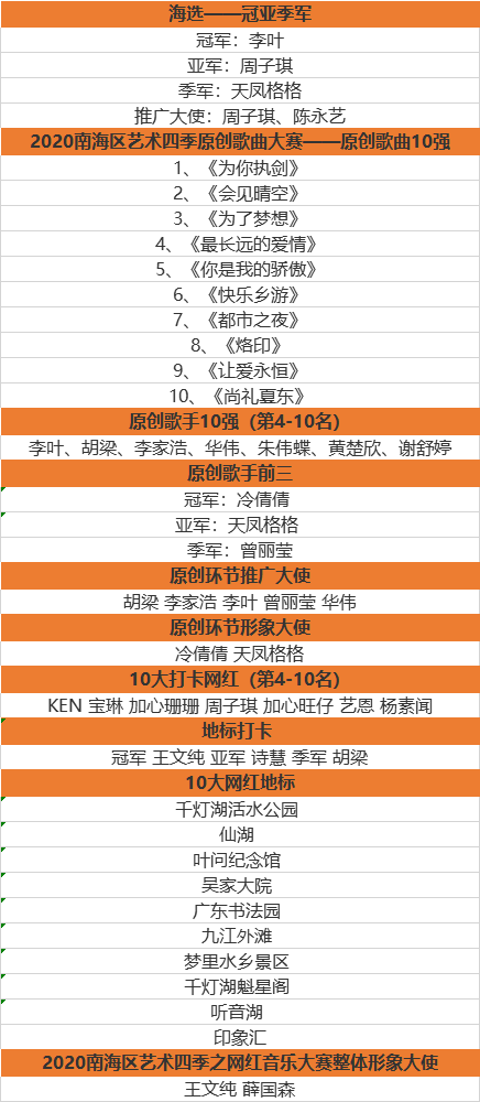 历时几个月,经过一系列赛事比拼,9月11日,赛事迎来收官时刻。最终,李叶获得海选大赛冠军,冷倩倩获原创歌曲大赛第一名,歌曲《你是我的骄傲》名列原创歌曲之首,王文纯喜提地标打卡大赛冠军,桂城千灯湖活水公园成为得分最高的地标打卡点。各个关于选手、歌曲、地点等奖项均决出前十。