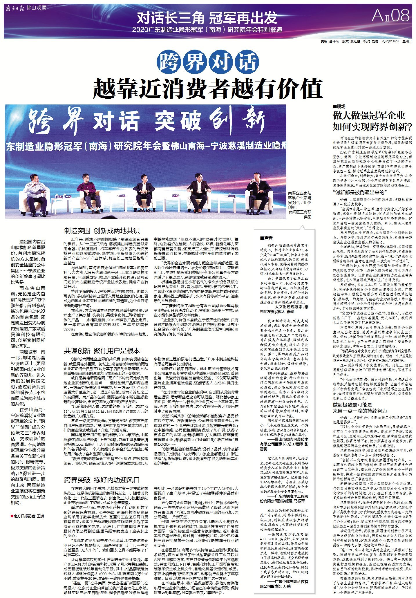 2020广东制造业隐形冠军(南海)研究院年会暨佛山南海—宁波慈溪制造业隐形冠军论坛上,南海和慈溪的隐形冠军企业代表发起了一场跨界对话,与广东制造业隐形冠军(南海)研究院执行院长李晓佳一道,探讨冠军企业发展的创新密码。