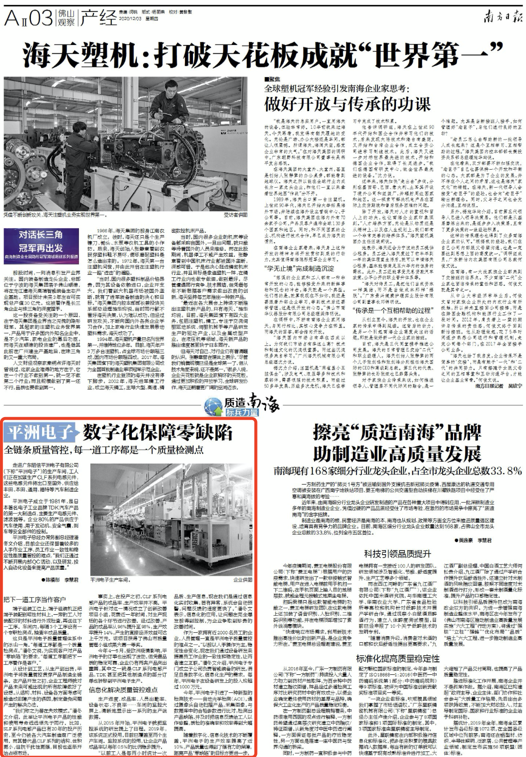这只是平洲电子质量管理体系中的冰山一角。“每道工序都是一个质量检测点。”潘冬文说,为实现客户对产品“零缺陷”的要求,“每道工序都把下一工序看作是客户。”