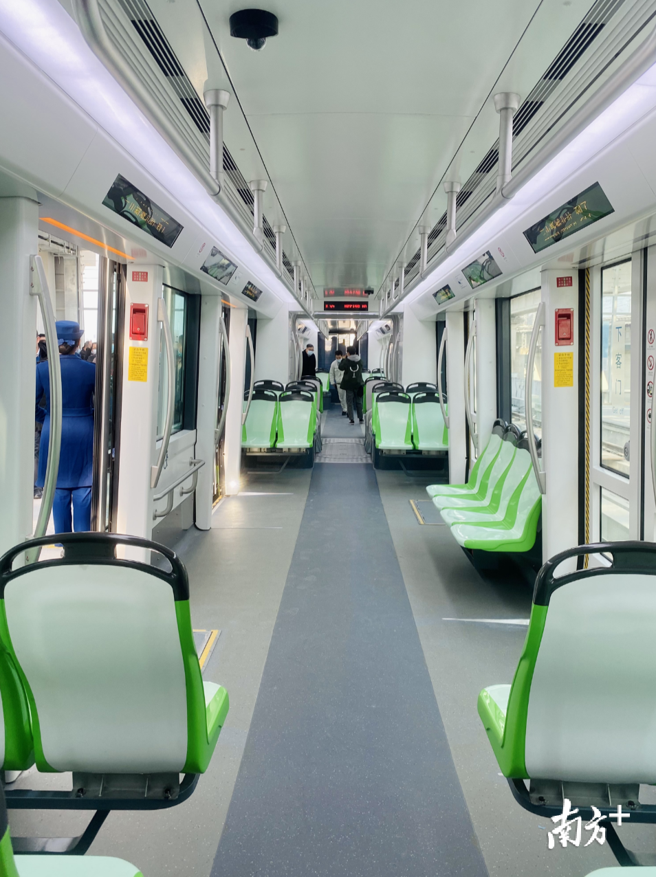 进入车厢,只见车厢内宽大整洁,车窗视野良好,座位分布车厢两侧,过道上方、车厢侧面设有多处扶手,方便站立旅客,每到一站均有报站,提醒乘车注意事项。